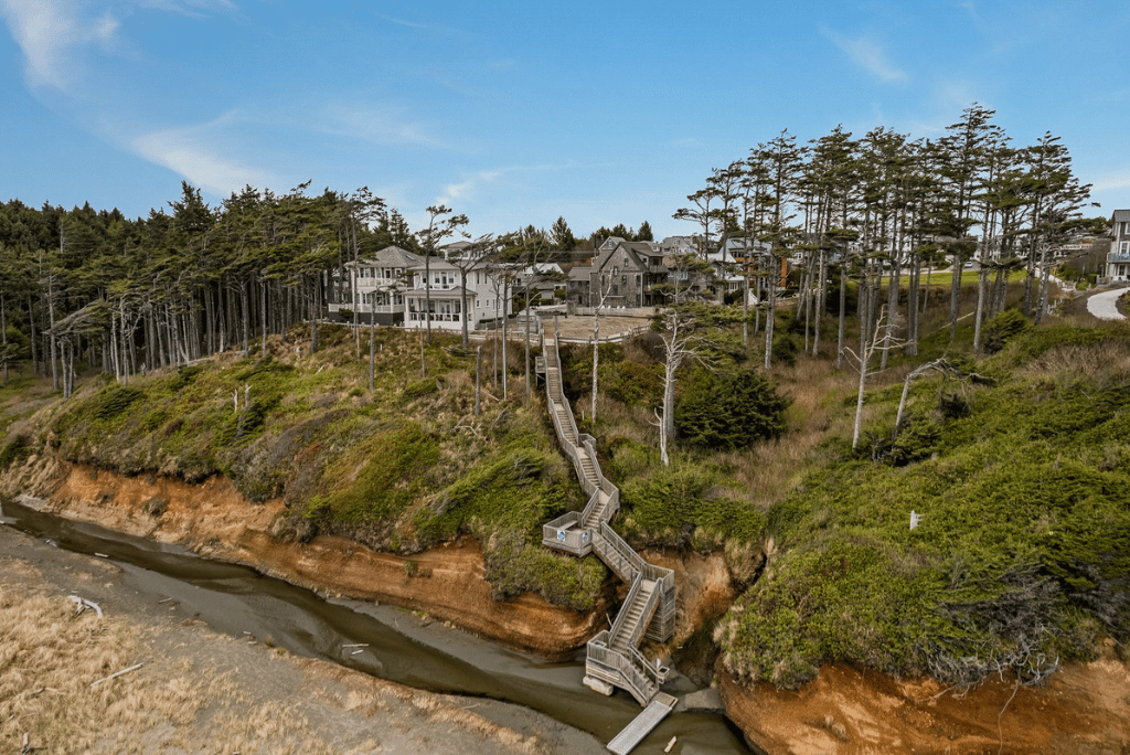 The Elk Creek Neighborhood is the southernmost of three oceanfront neighborhoods in Seabrook. Its northernmost Overlook Park is outfitted with multiple log benches and a picnic table providing a perfect spot to relax while taking in the ocean view. A wide sloping crushed oystershell trail leads down towards the Elk Creek Beach Access as well as to the central concrete staircase that leads back up into town by crossing Highway 109 into Kucera Park, located in the South of Market neighborhood. Kucera Park’s amenities include: a playground, pickleball court, community fire pit, and green space. In Elk Creek’s southernmost portion of the neighborhood, one can explore the dynamic Elk Creek wetland corridor with a meandering woodland trail that winds through a windblown coastal forest. Eventually, this trail reconnects to Highway 109 and The Gnome Trail located just across the scenic roadway. In addition, The Heritage Tree, a 200-220 (as of 2023) year-old Sitka Spruce is also located in Elk Creek at its southern end. Walking from this neighborhood to the walk-on beach access takes only a minute or two and is the only beach access that does not have stairs.