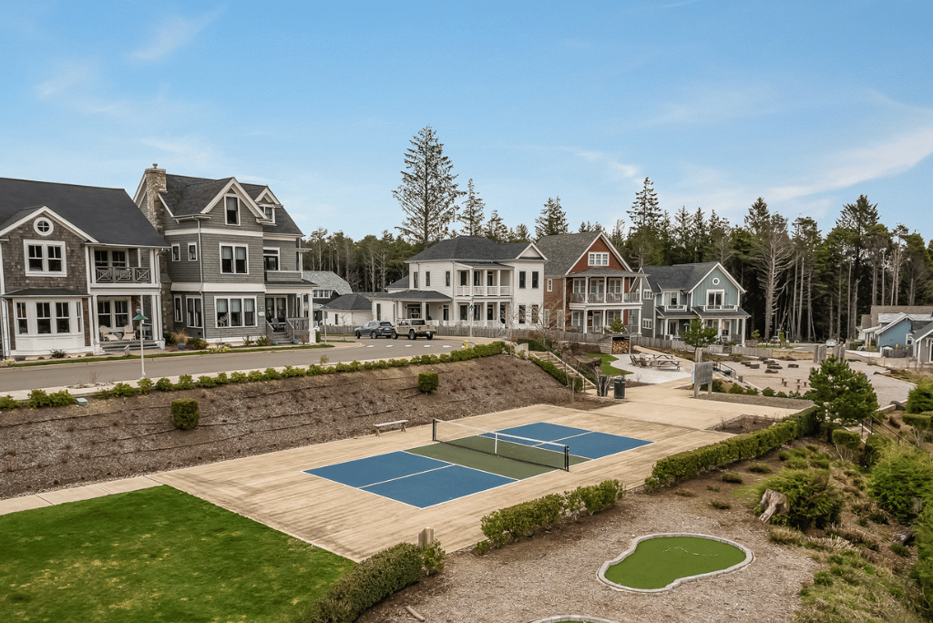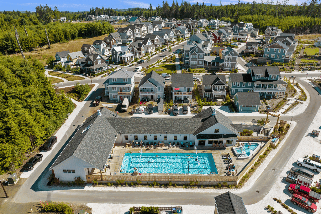 At the north end of the neighborhood is Fernwood Square, a perfect location for small and intimate events, and Fernwood Station’s courtyard games, featuring a turf game lawn, three ping pong tables, bocce ball, cornhole, picnic tables, and fire pits. Overhead string lights encompass the area, and a large Sasquatch statue provides an excellent photo opportunity. Adjacent to the games area is Pacific Edge Adventure Park, which offers an activity yurt, a skim pond, and more coming soon.