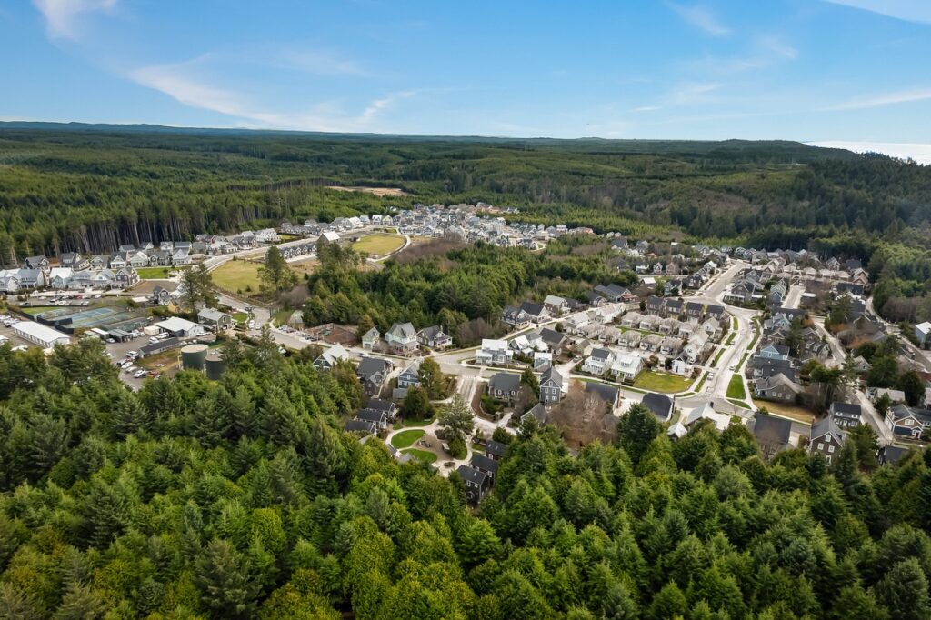 The Mill District is in the midst of a well-preserved forest stand and may be best known for its proximity to the ever-popular Gnome Trail where children enjoy making “gnome” homes out of the natural materials found on the forest floor. This same trail ultimately connects to a trail that leads to the Elk Creek walk-on beach access. The Mill neighborhood has a variety of additional trails, including a thoroughfare to the Farm District. A cozy and rustic community fire pit sits at the center of this neighborhood. Many of the homes in this neighborhood are a short walk away to the bocce ball court and community fireplace located in South Alder Park. This neighborhood is a short walk to both the indoor pool and outdoor pool and fitness center.