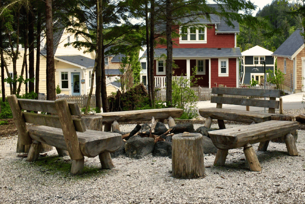 The well-established Alderwood District features the beloved Olympic National Park inspired Beach Camp cabins which front a community fire pit and provide for easy hiking trail access. North Alder Park sits on an intimate mid-block park with lawn, a wood-burning community fireplace and a woodshed. South Alder Park, similar to North Alder Park, is outfitted with a lawn, community fireplace, woodshed, as well as a bocce ball court. Compass Park completes this neighborhood with a grass lawn, an oyster shell path and benches to take in the town sights.