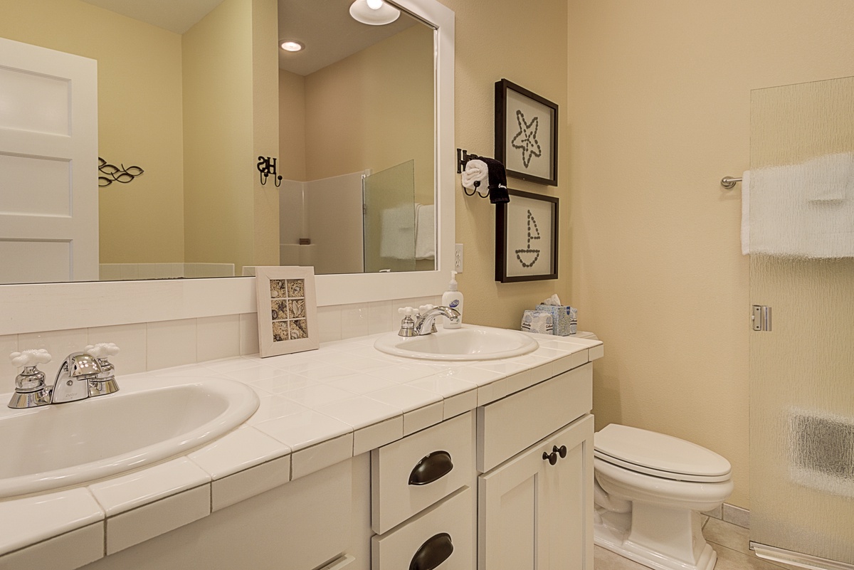 This modern home with classic beach architecture has an open floor plan with the primary bedroom and private bath on the main level. Also on the main level is a mudroom, laundry sink, washer/dryer and half bath off the fully equipped kitchen. An expandable dining table seats up to 10 with more seating at the kitchen island. The living area includes a wood burning fireplace, comfortable furniture and large flat screen TV. Upstairs are two more bedrooms and a large media room allowing a separate entertainment area. Bedroom 1 has a queen bed, extra twin bed, TV and private bath. Bedroom 2 has a queen bed,desk and TV. The media room has a Smart TV, and large comfortable queen sofa-sleeper. A full bath completes the upstairs amenities.