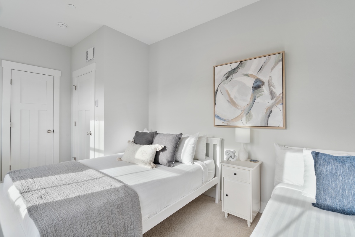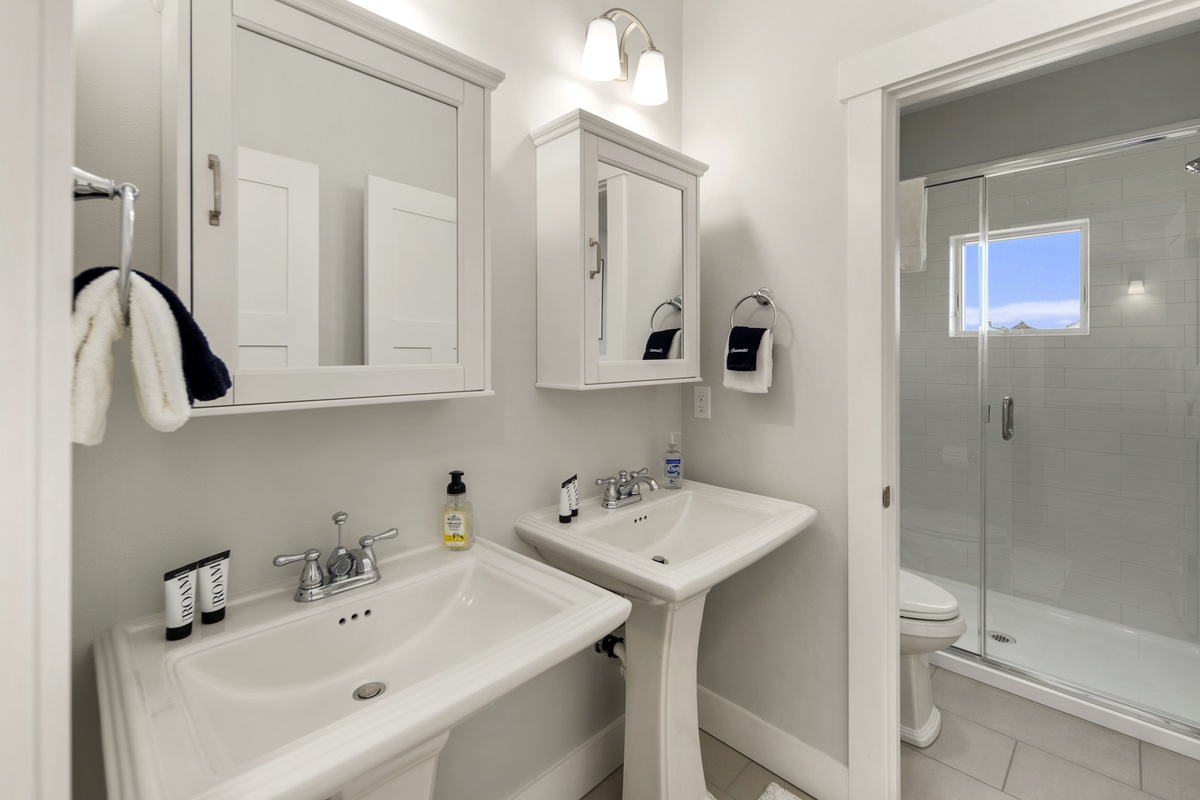 At the end of an action-packed day, head upstairs to catch some well-deserved rest in the primary king bedroom or guest queen bedroom. The primary bedroom offers beautiful ocean views to the northwest, and the queen bedroom is equipped with a remote work desk for focusing on those last few emails before heading out on the town.