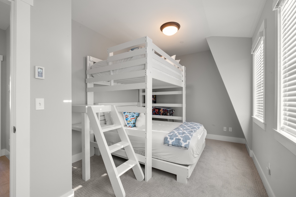 Retreat up another set of stairs to the top floor, where the primary king bedroom and a fun bunk bedroom await high above the hustle and bustle of Town Center. Soak in beautiful ocean views from the primary bedroom and feel like you’re sleeping amongst the clouds in the comfortable king bed. The bunk bedroom down the hall doubles as a fun hang-out spot, with a full-over-queen bunk bed and a virtual arcade pinball machine for the kids and kids at heart! Need some extra sleeping space? The living room on main floor has a queen sleeper sofa.