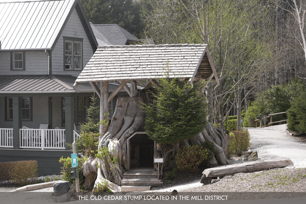 The Old Cedar Stump – The stump is located in the Mill District. Take a look at the large notches on the stump’s outside perimeter. These notches were where loggers would place wooden longboard planks in order to stand and fell the tree with sizeable 2-person metal hand saws known as “misery whips.” To protect this historic stump, Seabrook designed a roof over it to shed water and allow it to exist much longer into the future as an important relic of the old-growth forests that once stood on these lands prior to being lumbered near the turn of the last century.