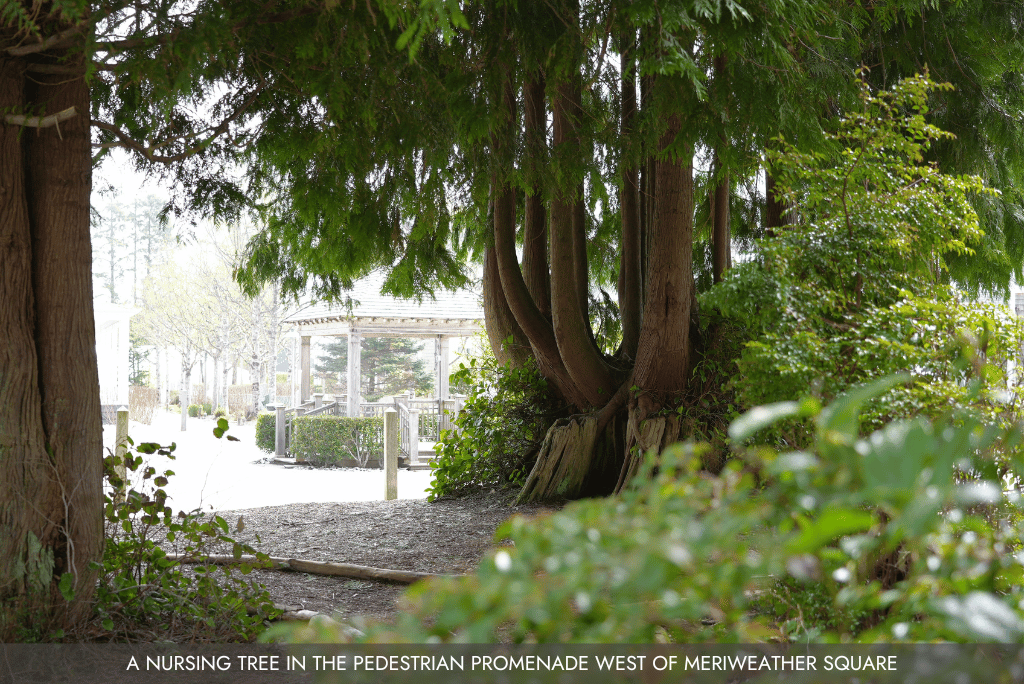 The Woodland Promenade – The pedestrian promenade located west of Meriweather Square was left as untouched as possible, with the original town plan being altered to conserve the space. Take note of the nursing trees inside of the promenade for a glimpse into the area’s history, specifically on the east end of the promenade, where the “Octopus” cedar tree grows out of a leftover stump from the earlier logging days.