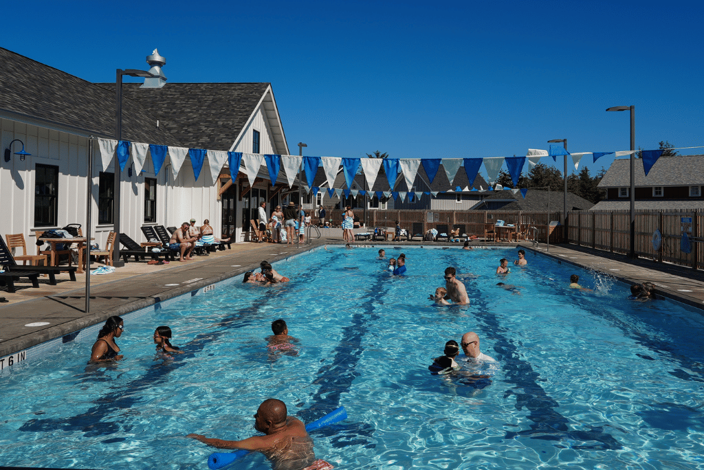 The 25-yard, 3-lane lap pool and 20-person spa are officially open, with homeowners and guests splashing around daily! This new year-round amenity is an unforgettable highlight of the summer. Attached to the pool facility is the Sunrise fitness center, complete with all the best gym and workout equipment. Homeowners and Seabrook guests are welcomed through a large log arbor entrance into the lobby for check-in. If they wear their resort wristband, there’s no need to check in. A retail space within the building will offer items such as goggles and swimsuits for purchase.
