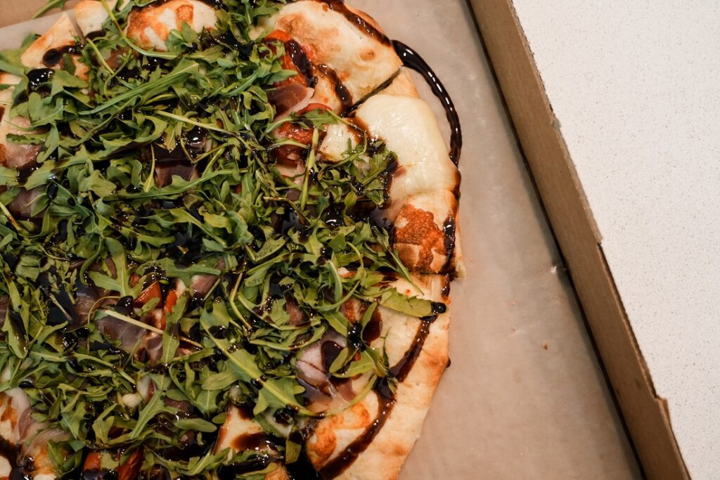 The perfect balance of savory flavors and the unbeatable freshness of Frontager’s Pizza Co. pizza comes together on the prosciutto di parma pizza topped with prosciutto, fresh mozzarella, tomatoes, and arugula all complemented by a tangy and subtly sweet balsamic reduction and olive oil.