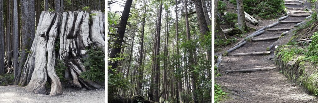 The trail is one of the old skid log roads that loggers used to harvest timber. At the base of the trail, hikers can see a large log with a flat top where logged trees were skidded across to what was formerly known as “Santa Claus Corner” due to the logger who directed the removal of the logs’ resemblance of Santa Claus. Visitors can also see notches in the stumps that are remnants of the logging history in the area.