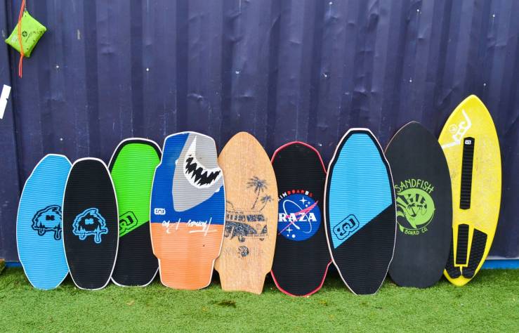 Learning how to skimboard is all about familiarity and understanding that the board isn’t something to be afraid of. For new learners, the instructors start with practicing on grass turf outside of the shop. By wetting the turf, you can practice running, throwing, and stepping on the board. It’s described as running and sliding on hardwood floors in your socks, Risky Business style. In the summer, you can test your footing in the skimpool before heading to the beach.