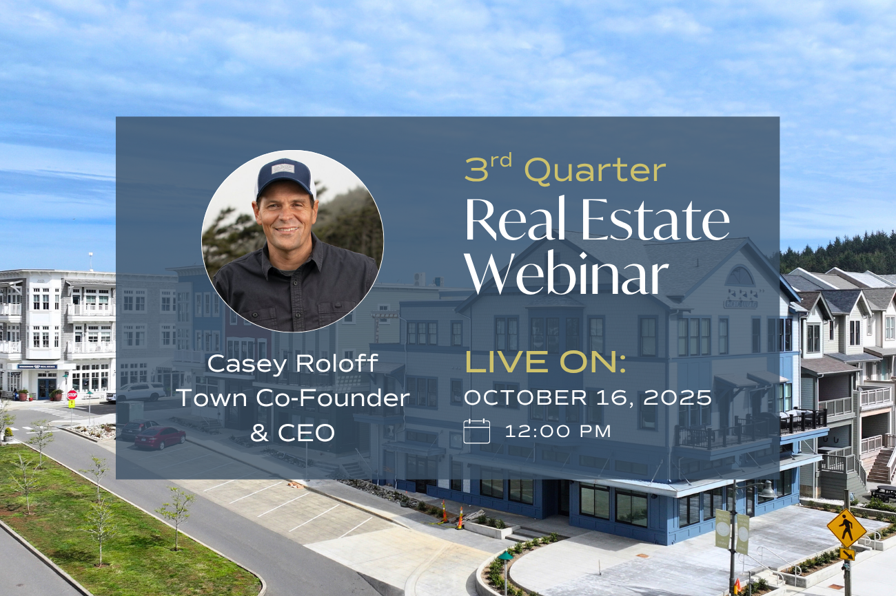 Join CEO and town co-founder, Casey Roloff, on Thursday, October 16, 2025, at 12:00 PM for the 3rd quarter real estate webinar.