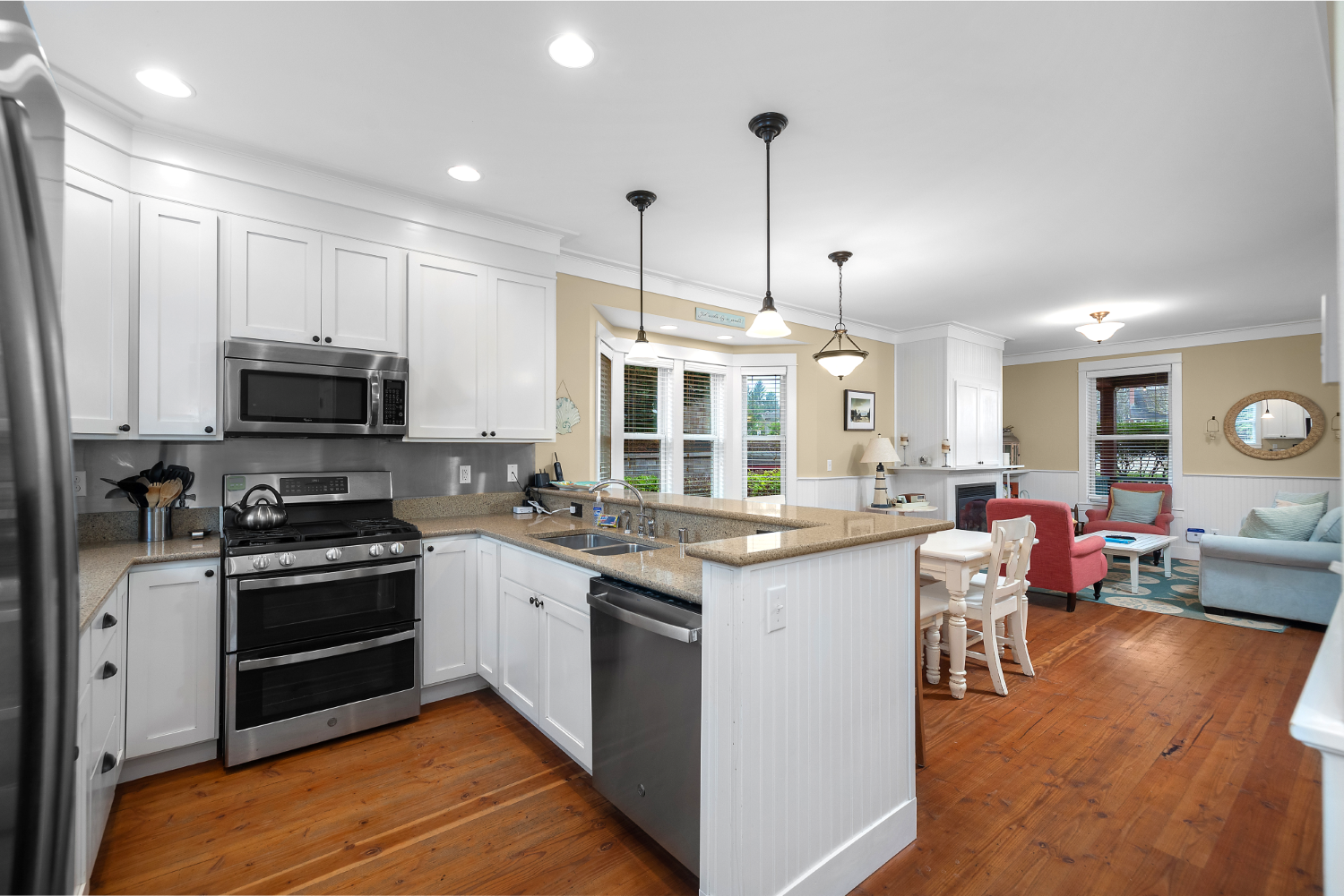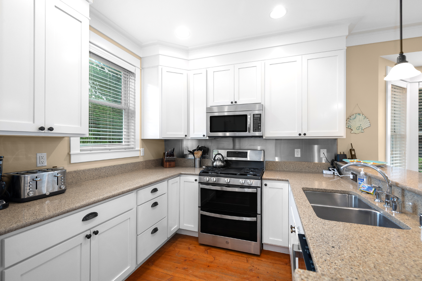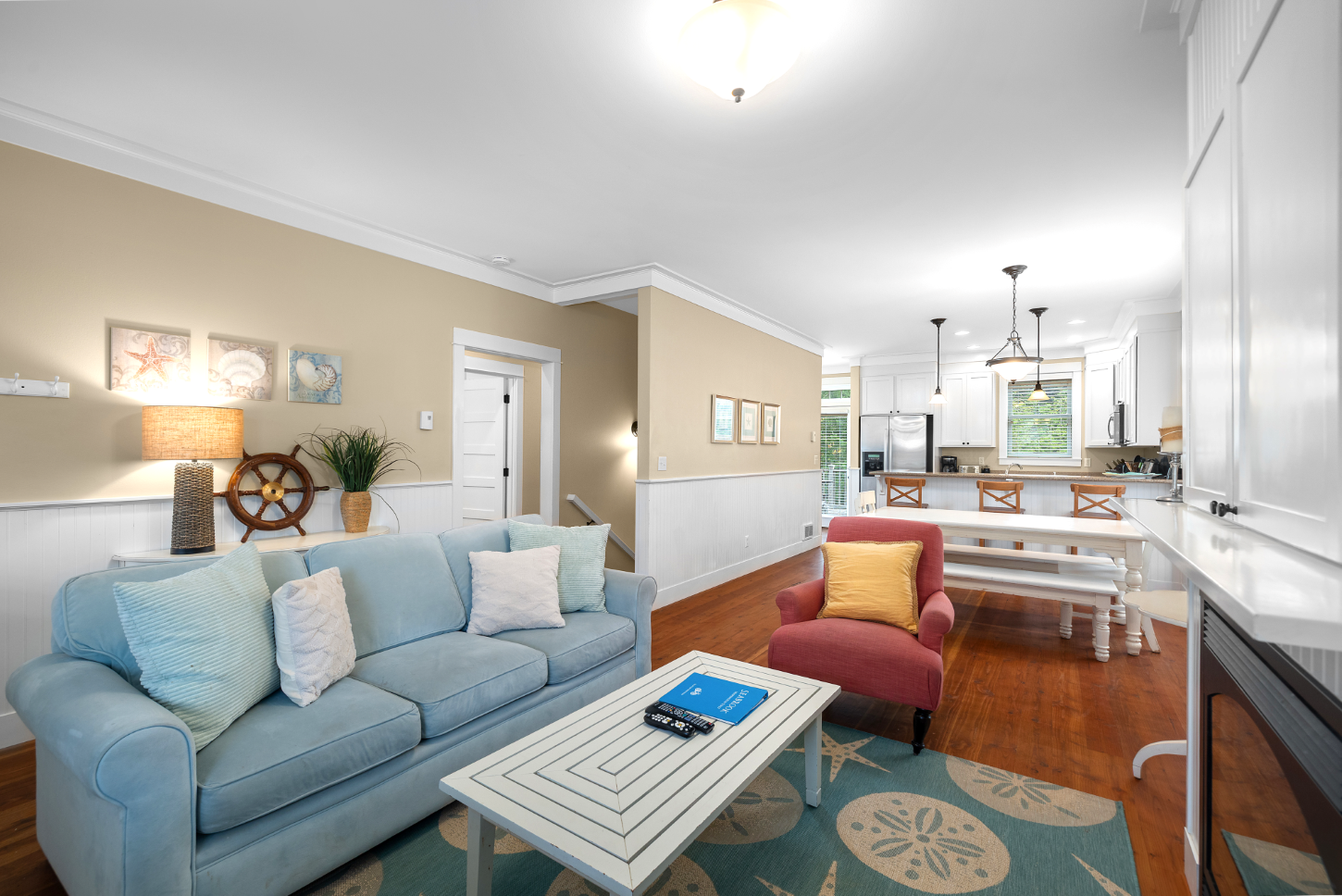 This spectacular 4-bedroom, 3-bath Seabrook home captures the essence of coastal living. Its unique placement makes it one of the most central and private properties in town. Inside, a gourmet kitchen and dining room create a single, bright, open space. The home also includes a large media/rec room and an additional 500 sq ft flex space (on top of the 1,918 sq footage) above the main floor spanning the full length of the house. Step outside to an oversized deck overlooking a quiet natural setting. The forested area behind the home offers walking trails, a large bike shed, and a private fire pit. This beach home is sold fully furnished and has a proven track record as a vacation rental.