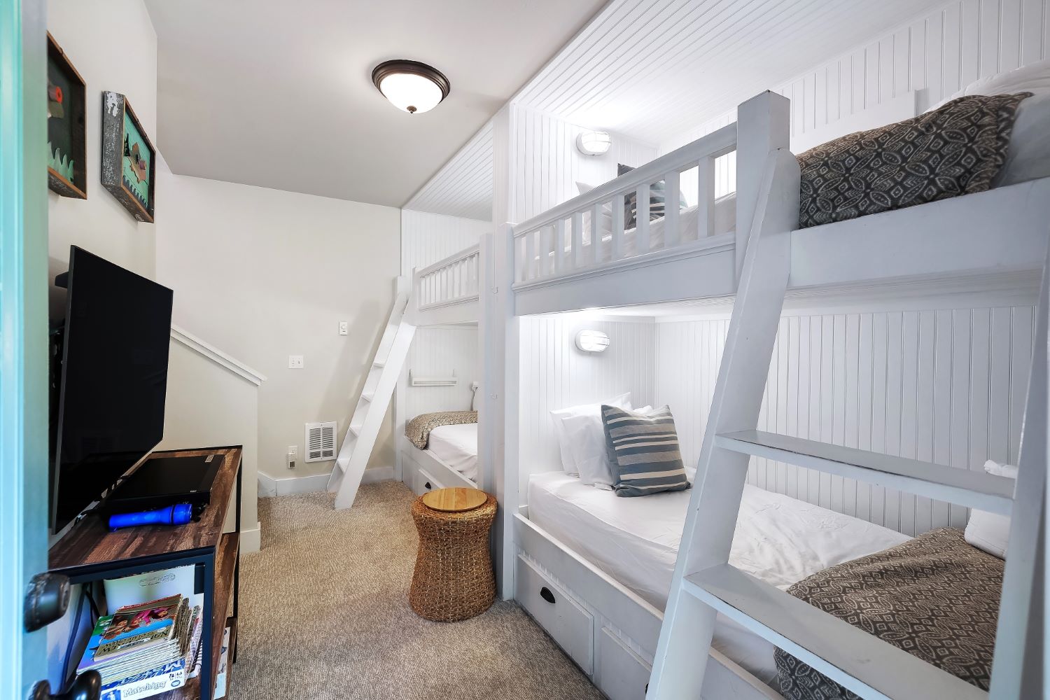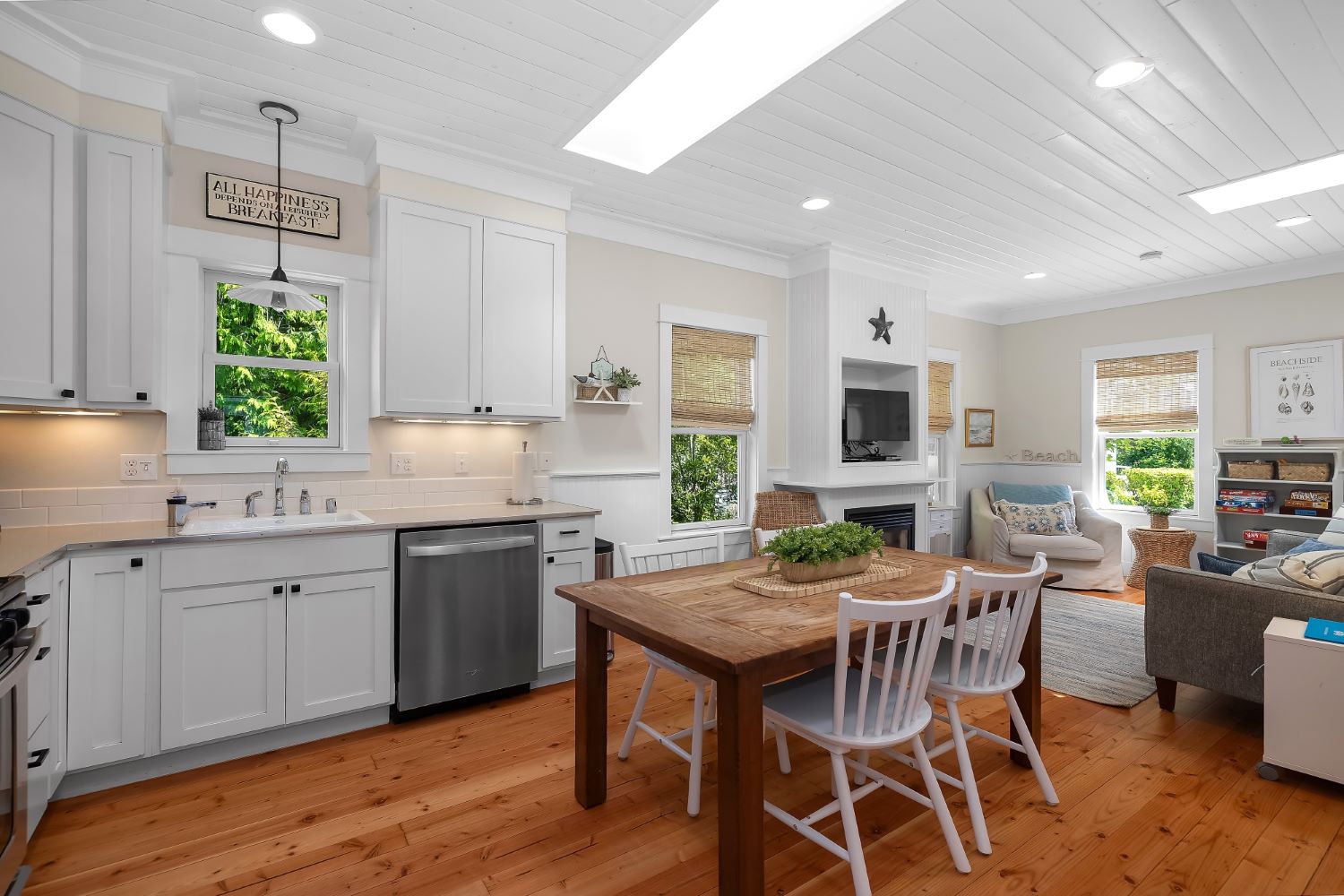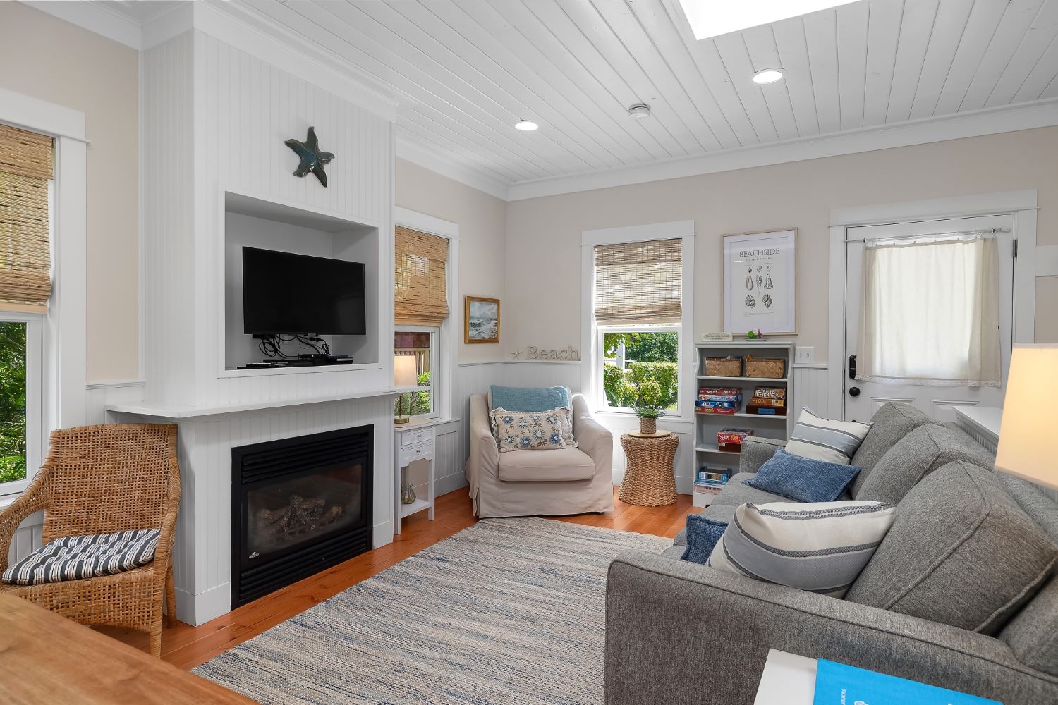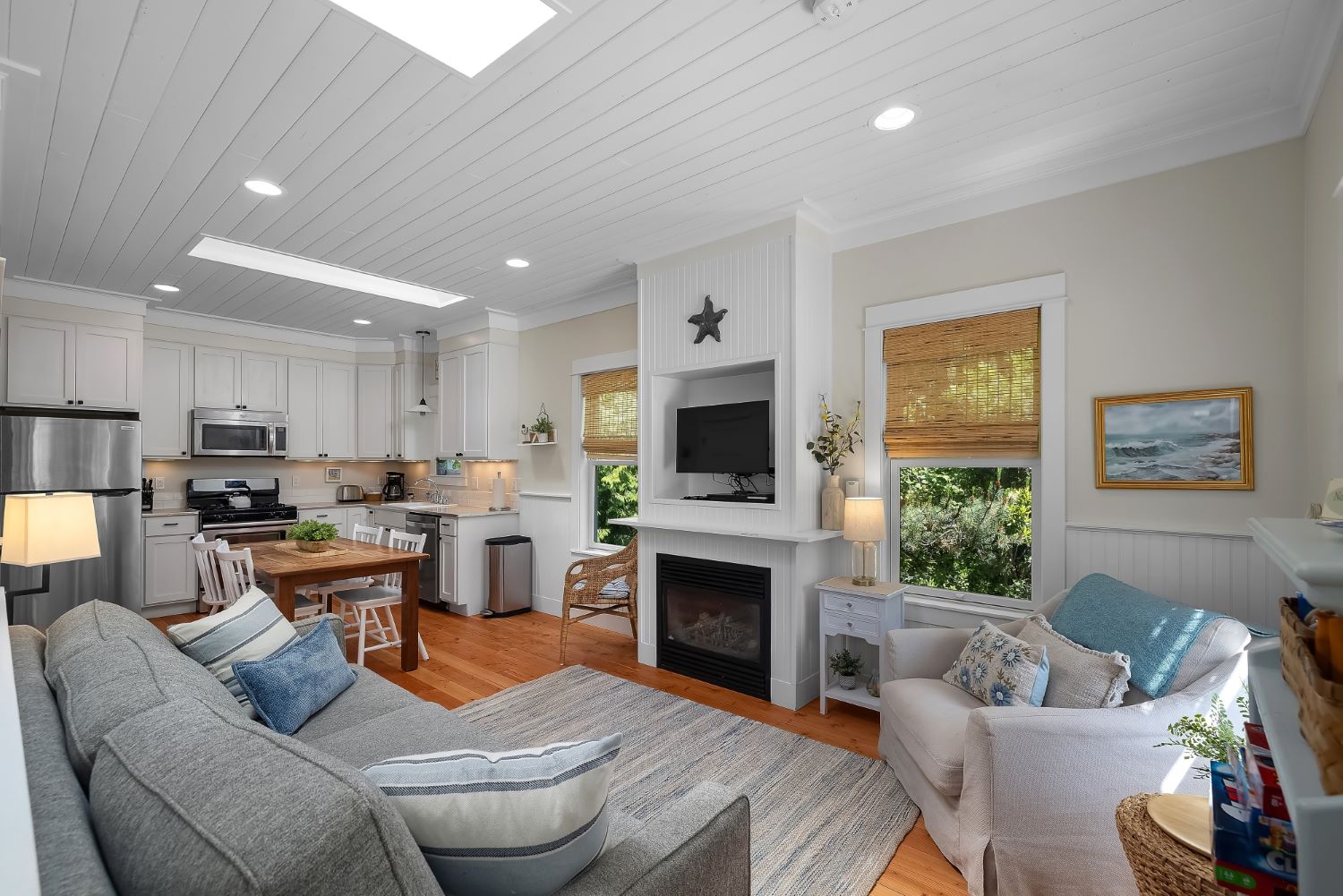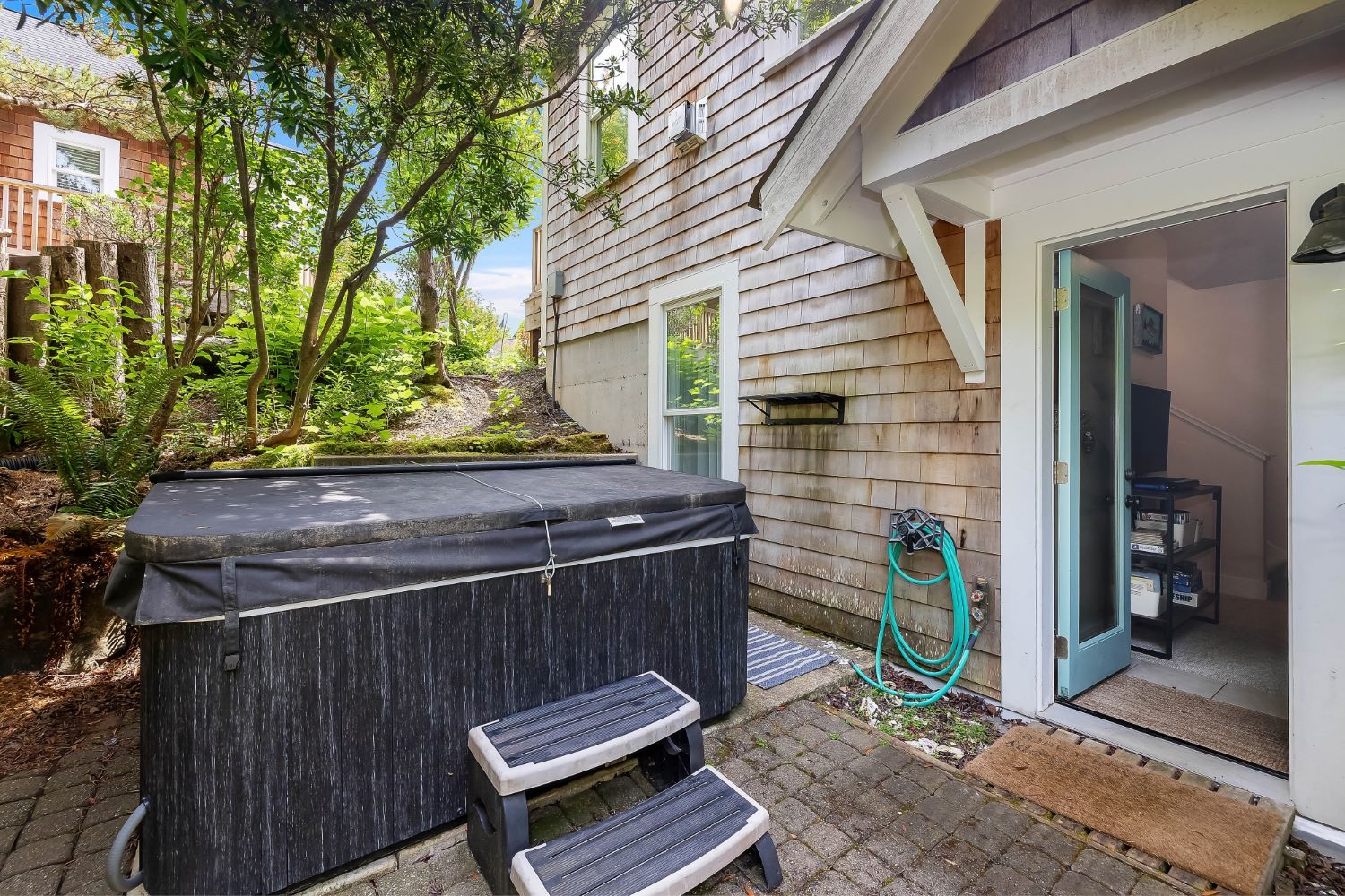 Beachy Keen is a unique two-story Beach Camp home, located on a wooded corner lot. Enjoy an open living room and kitchen with skylights, bamboo blinds, planked ceilings, and a gas fireplace. Downstairs has high ceilings, a bunk area with four built-in extra-long twin beds with their own individual lights, shelves & drawers, and a queen primary bedroom offering tranquil forest views. The bathroom has a tile floor heating system. The lower level opens to a private patio surrounded by forest, featuring a bike shed and a seven-person hot tub for evening relaxation under the clear sky, with sounds of the ocean. The beach is a short walk away. This property is sold furnished, and has new carpet & new hardwood floors.