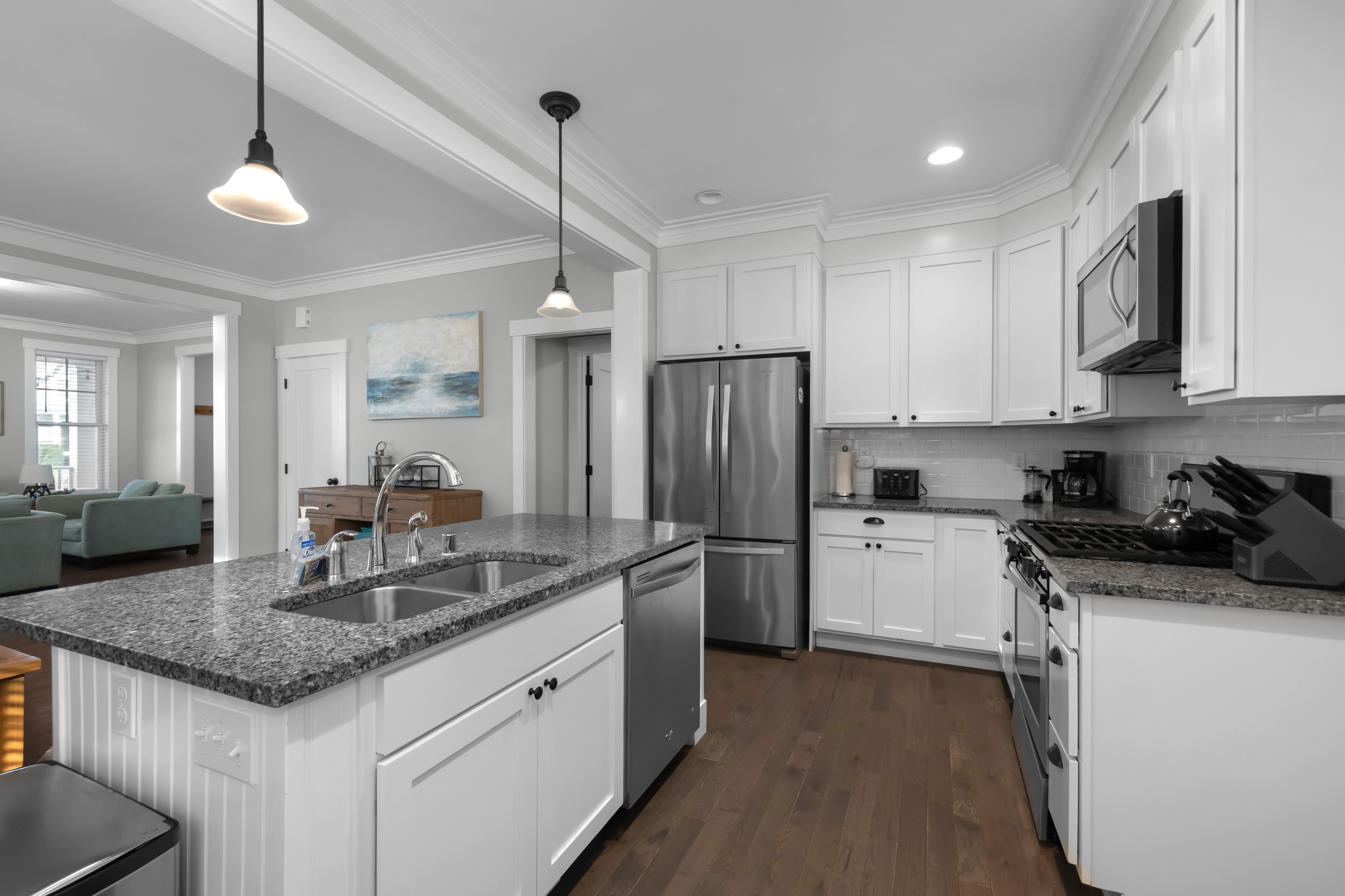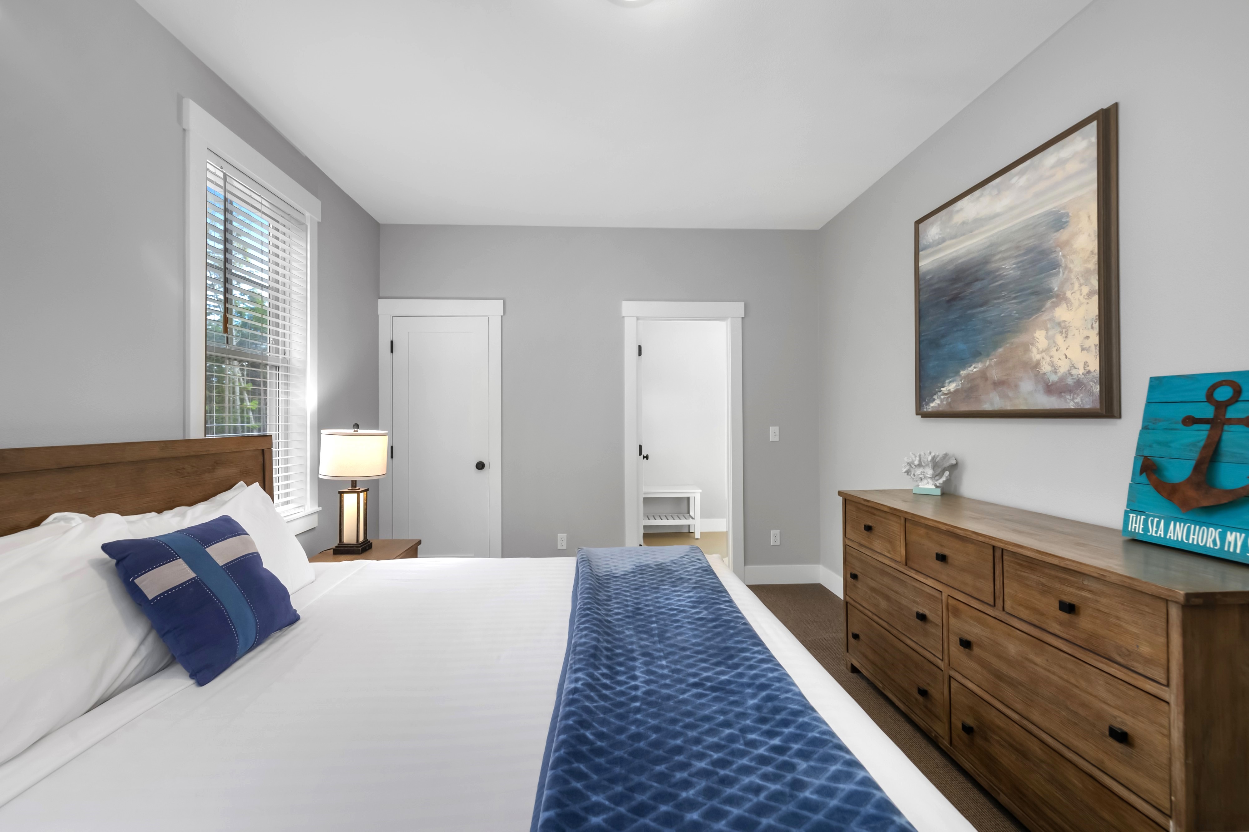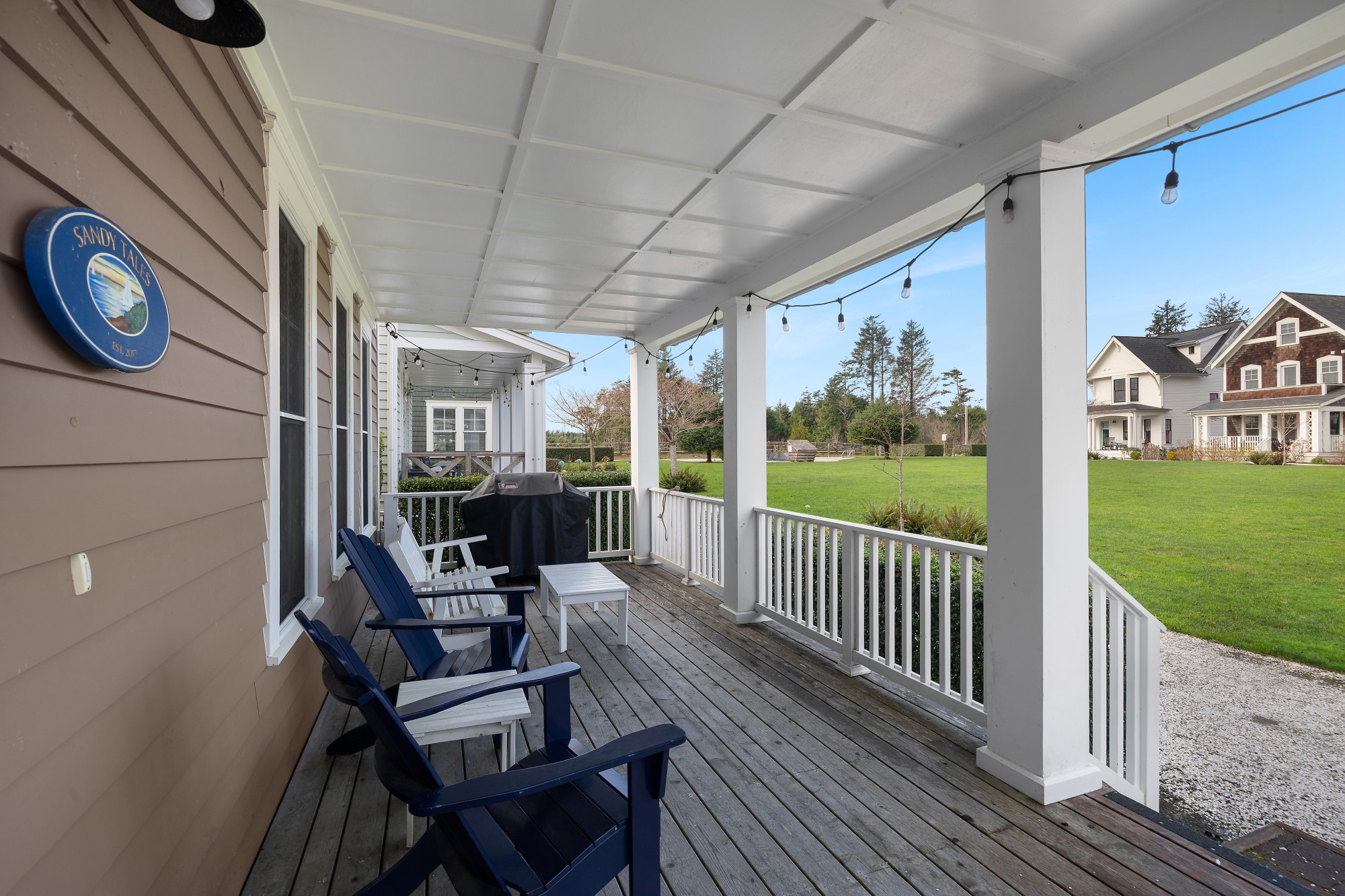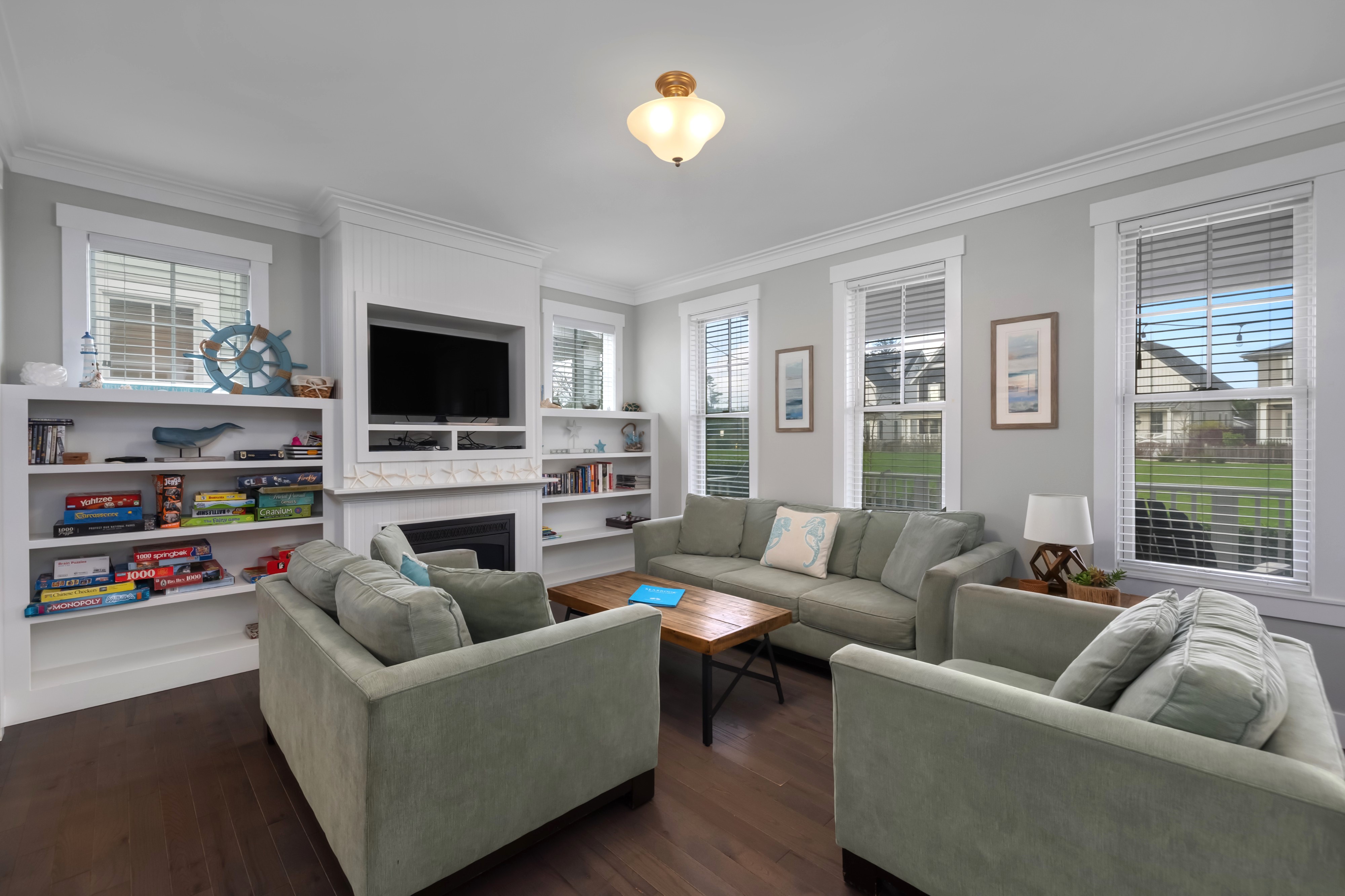 Located in the Farm District, overlooking Horseshoe Park, Sandy Tales is within walking distance to everything in Seabrook. This home features three and a half baths, three bedrooms, including two primary suites and a bunk room, all with walk-in closets. An open floor plan connects the kitchen, dining, and living area with a gas fireplace. The upstairs rec room offers a great versatile space. Enjoy private outdoor areas with a hot tub and a large front porch. Located within a five-minute walk to town, enjoy trails, tennis, pool, and the beach. This happy home comes fully furnished and ready to enjoy.