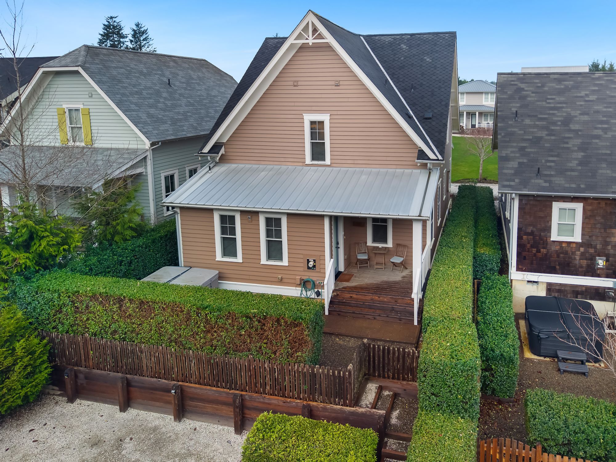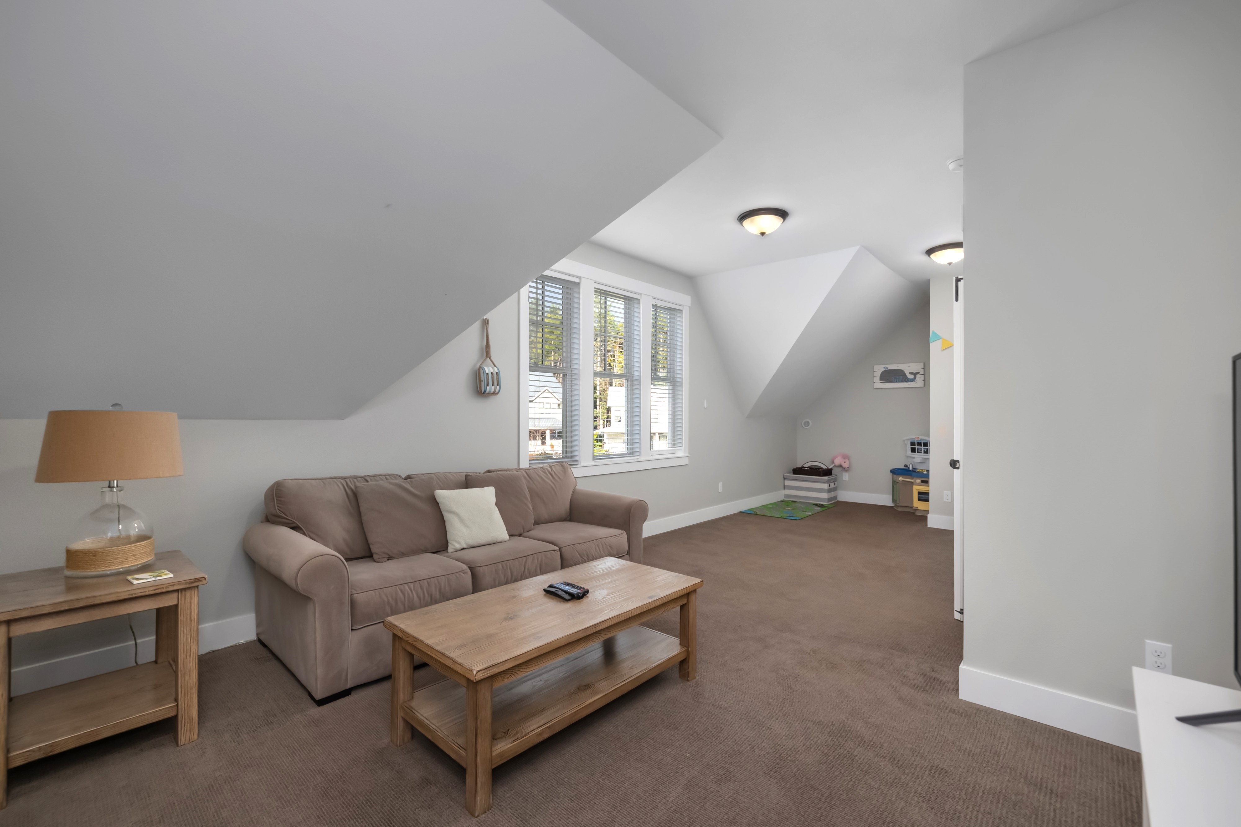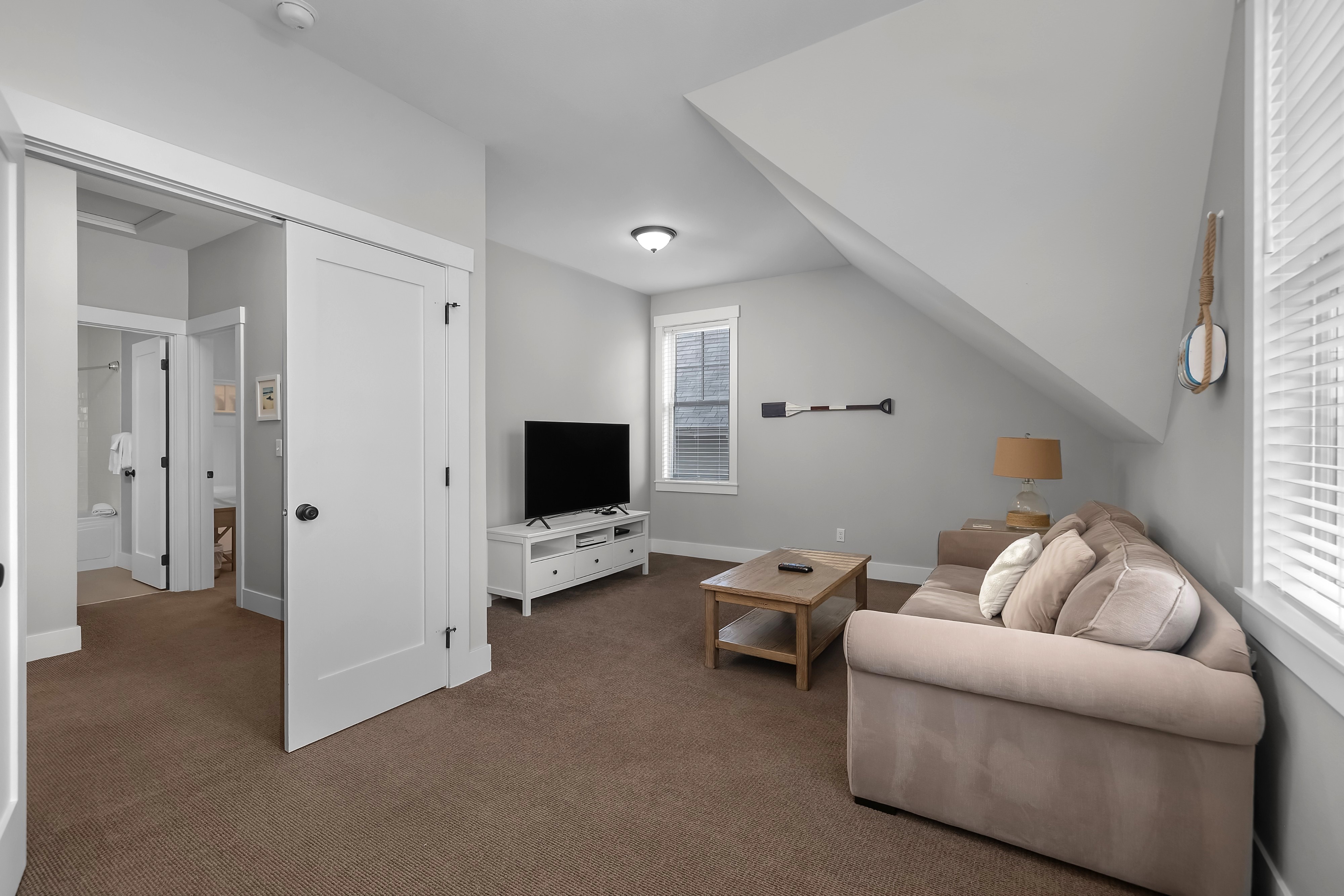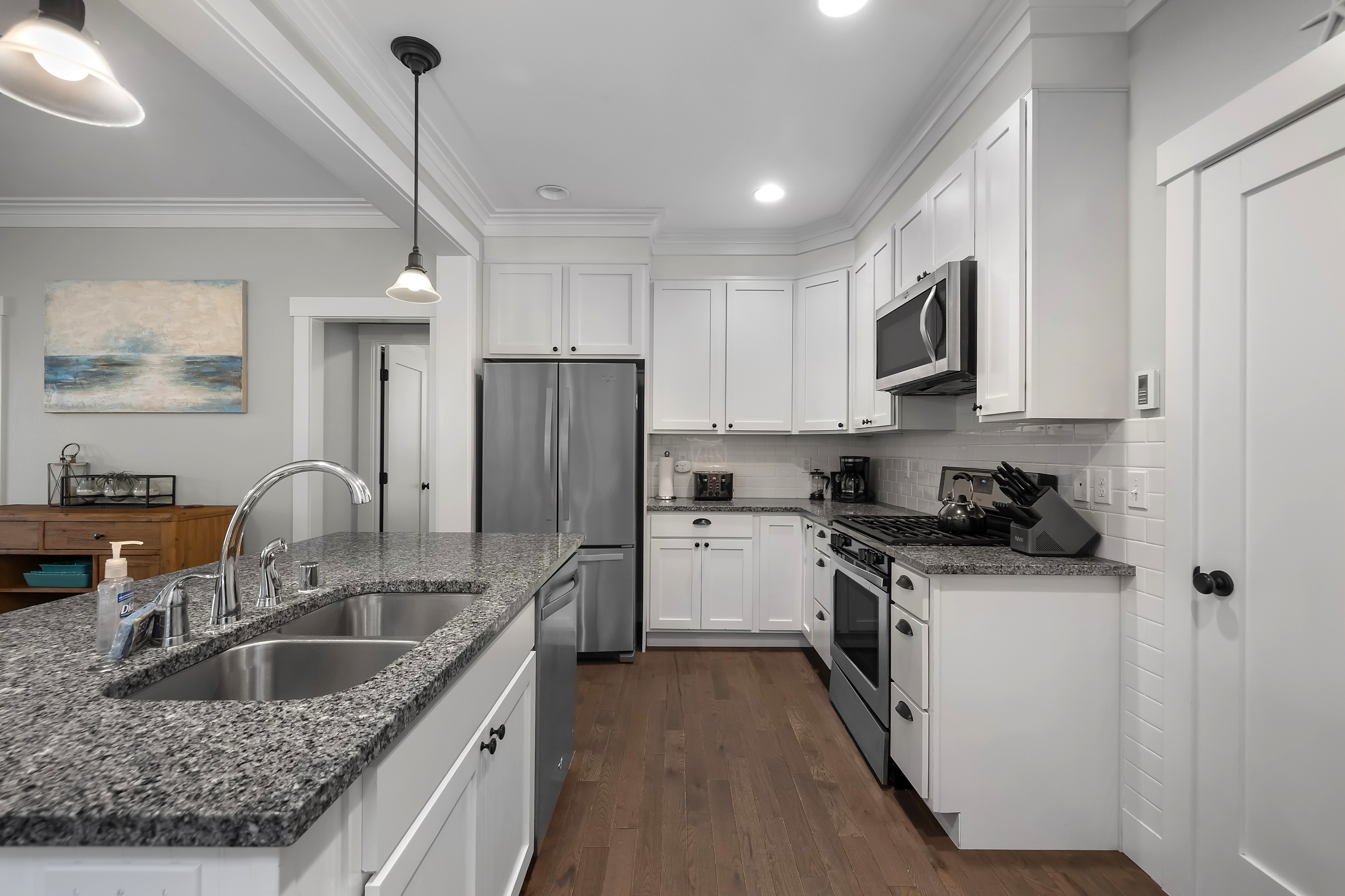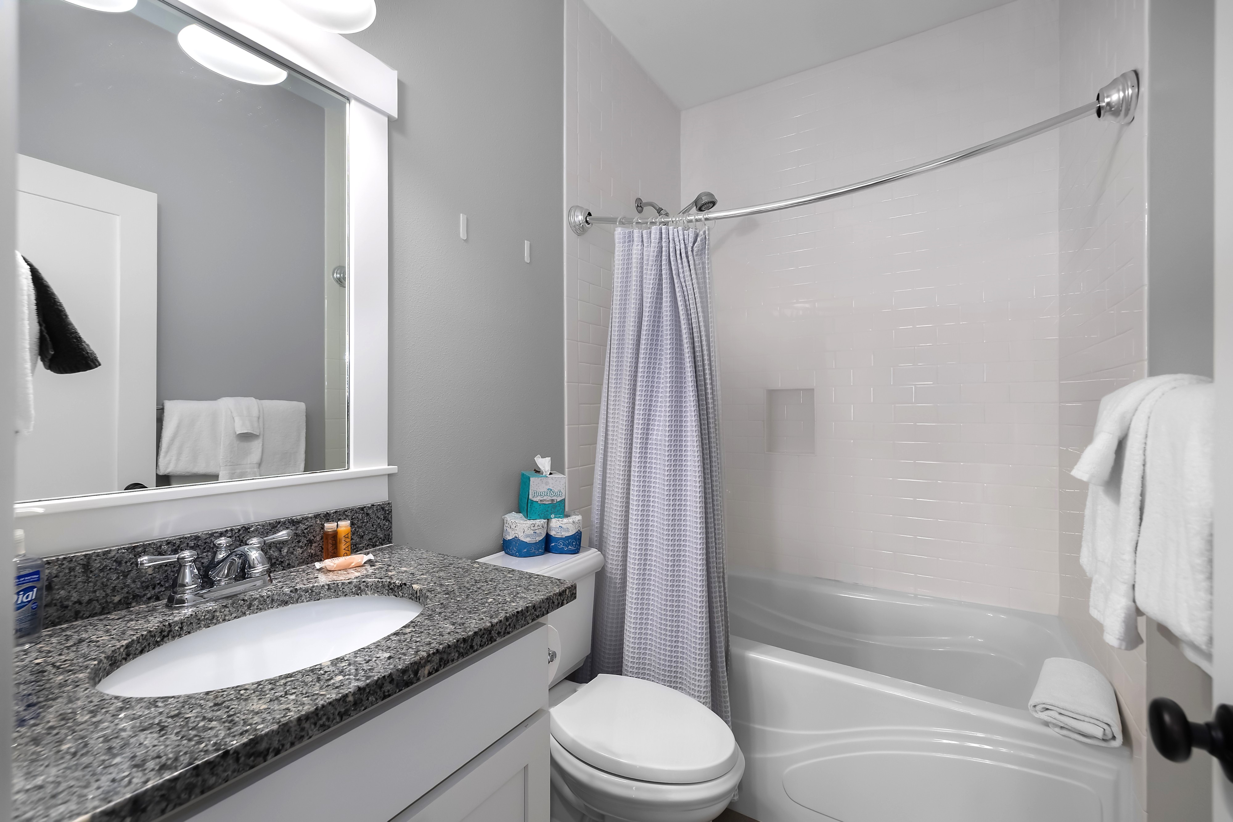 Located in the Farm District, overlooking Horseshoe Park, Sandy Tales is within walking distance to everything in Seabrook. This home features three and a half baths, three bedrooms, including two primary suites and a bunk room, all with walk-in closets. An open floor plan connects the kitchen, dining, and living area with a gas fireplace. The upstairs rec room offers a great versatile space. Enjoy private outdoor areas with a hot tub and a large front porch. Located within a five-minute walk to town, enjoy trails, tennis, pool, and the beach. This happy home comes fully furnished and ready to enjoy.
