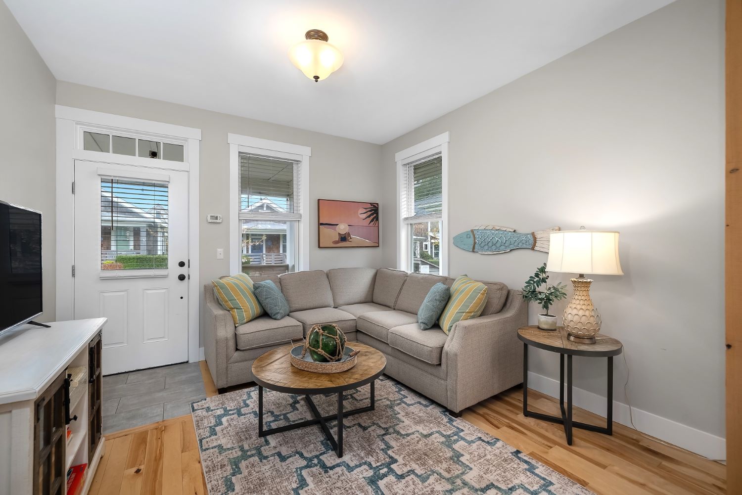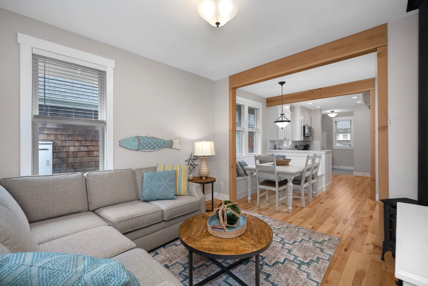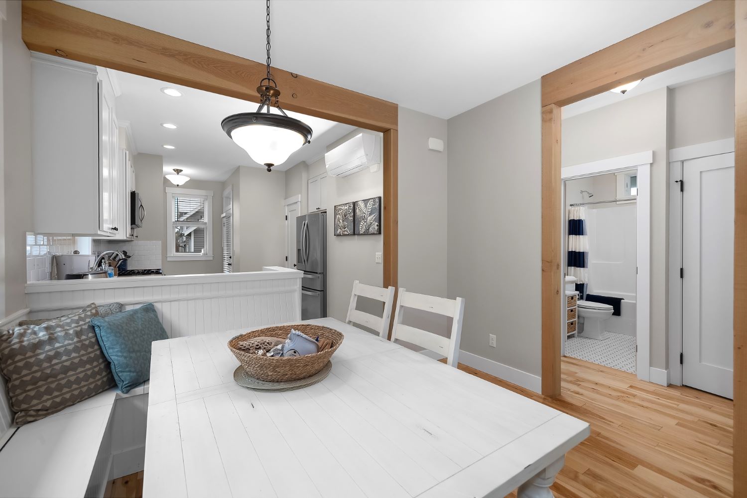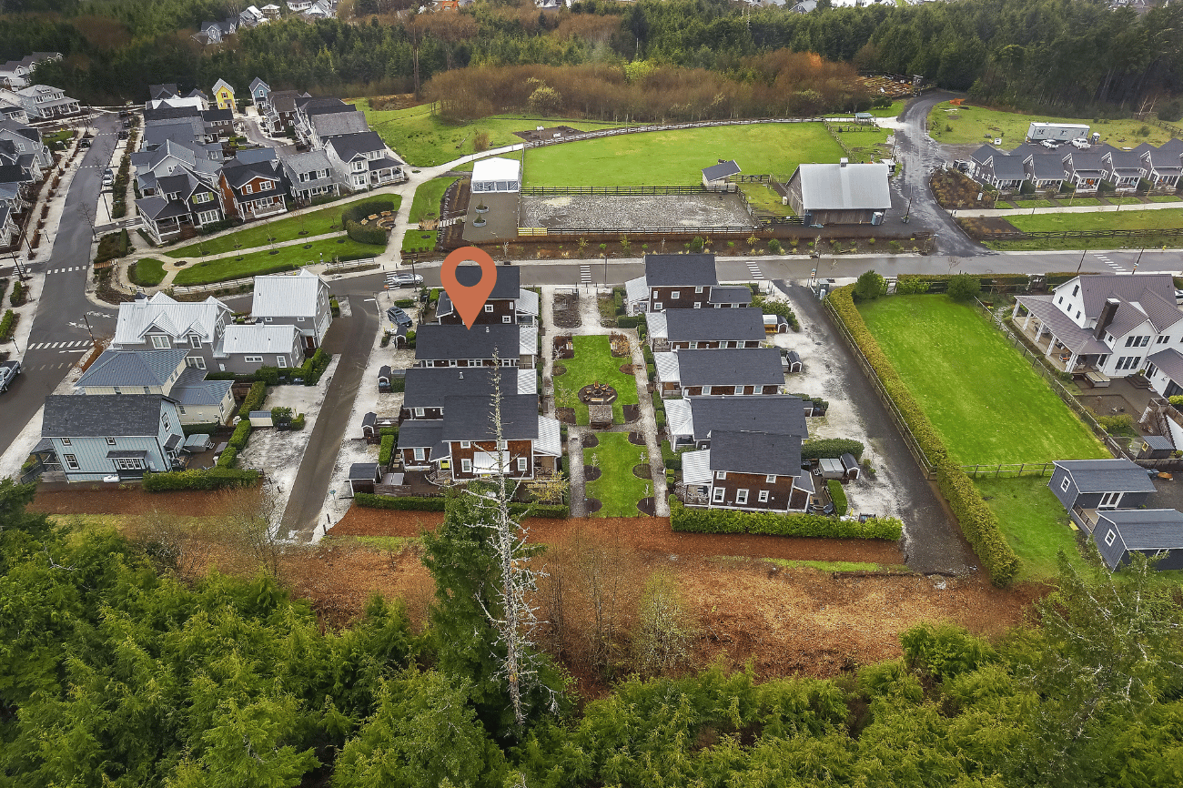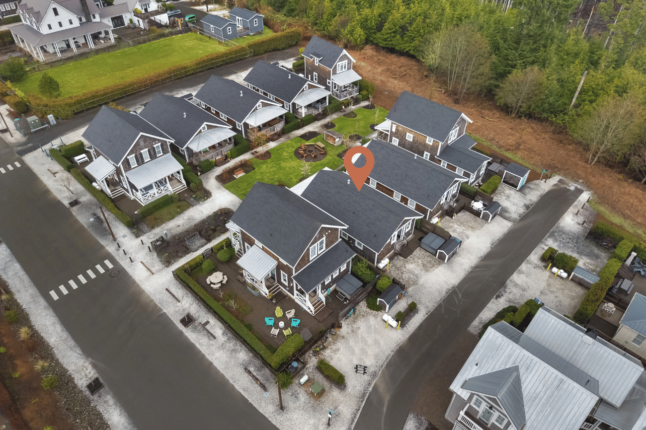 Welcome to coastal living in this bright and cozy home located in The Croft neighborhood. This charming residence features an open-concept design that effortlessly connects the living, dining, and kitchen areas. Character-rich, custom-built elements enhance the space, including practical mudroom bench storage and built-in dining room bench seating. The private primary bedroom boasts an en-suite bathroom. A second bedroom is situated near a separate full bathroom. The outdoor area is ideal for enjoying the coastal air, offering valuable off-street parking, a useful storage shed, and a soothing hot tub. Relax on the welcoming, covered front porch or socialize with neighbors around the community fire pit, conveniently located right outside the front door. The home is perfectly situated for leisurely strolls to the town center or the beach.