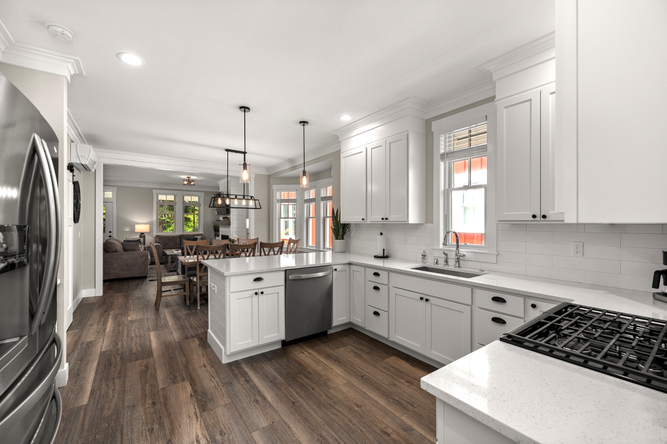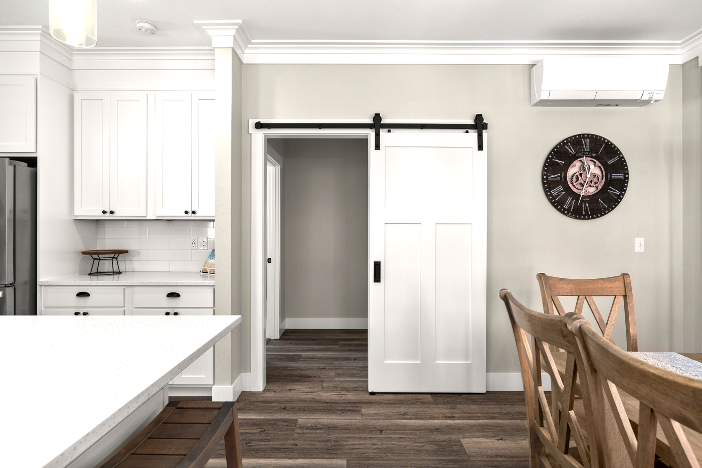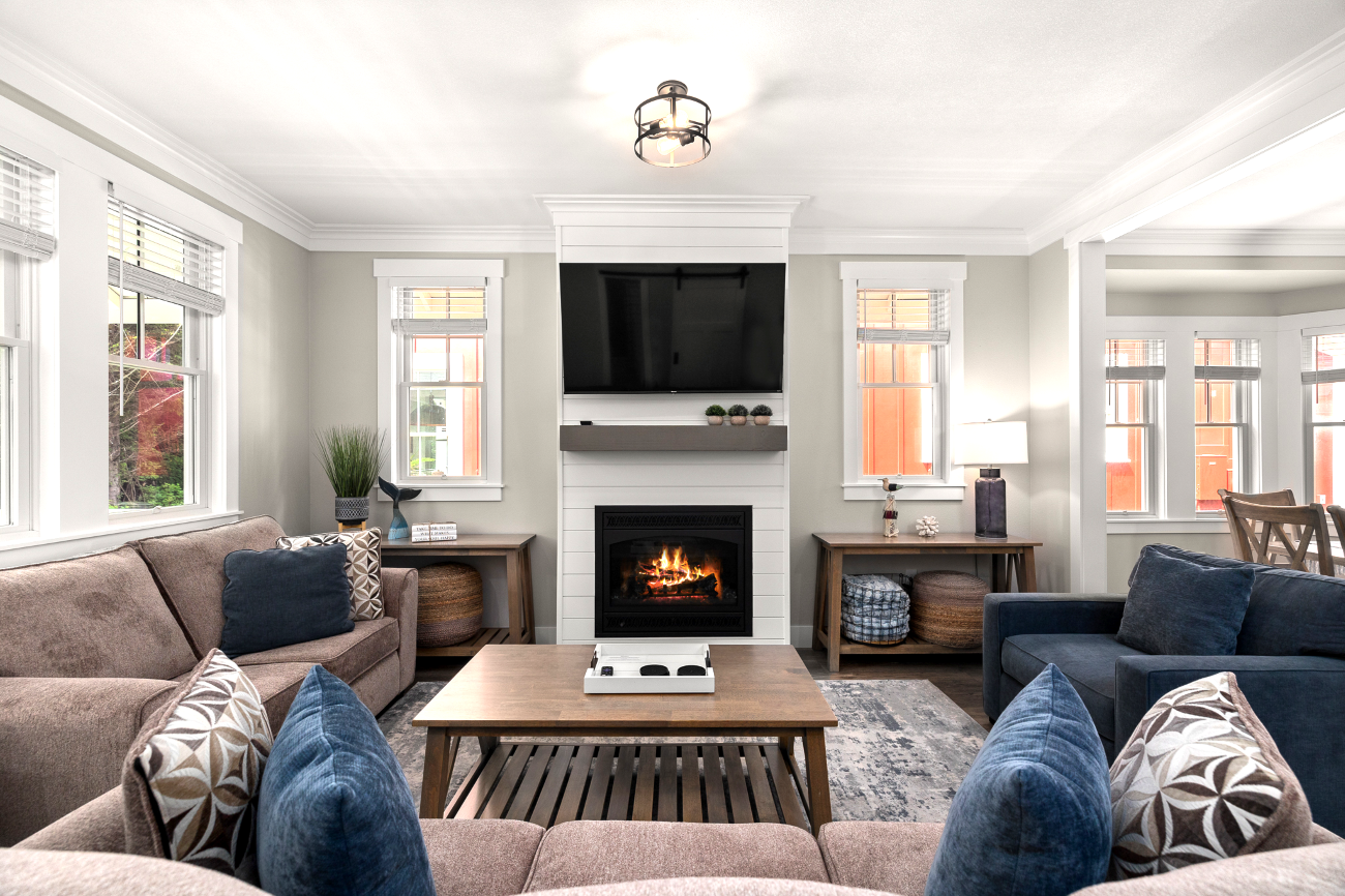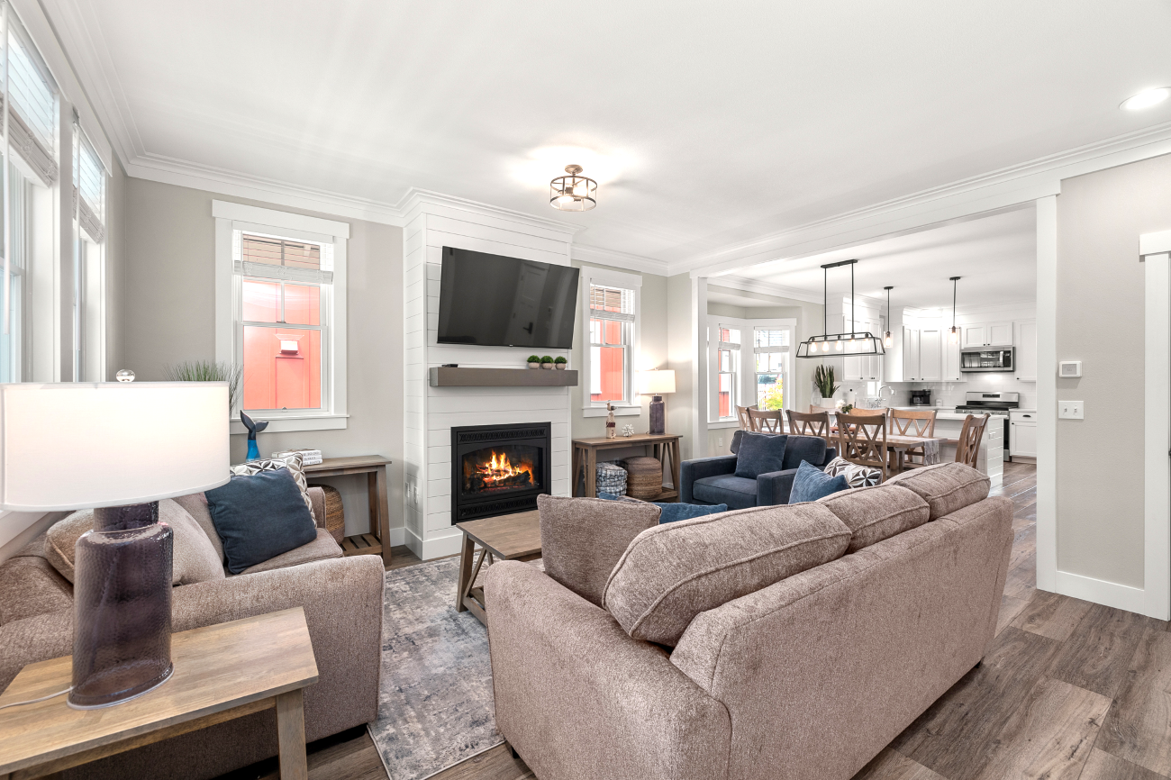 This light-filled, open-concept home is designed for seamless living. The common area features a cozy living room with a gas fireplace and classic shiplap accents, providing warmth and ambiance. Quality finishes throughout include elegant crown molding. The kitchen has pearl quartz countertops, stainless steel appliances, full subway tile backsplash, ample cabinetry, and a large central island for prep and serving. The layout includes three bedrooms. The spacious primary suite features an en suite bathroom with high-end fixtures. A sliding barn door adds privacy between the main living area and the guest suite, which includes two bright bedrooms and a beautifully finished shared full bathroom. A dedicated mudroom offers a durable floor and built-in storage, strategically located for easy entry and shedding outdoor gear after exploring nearby trails.