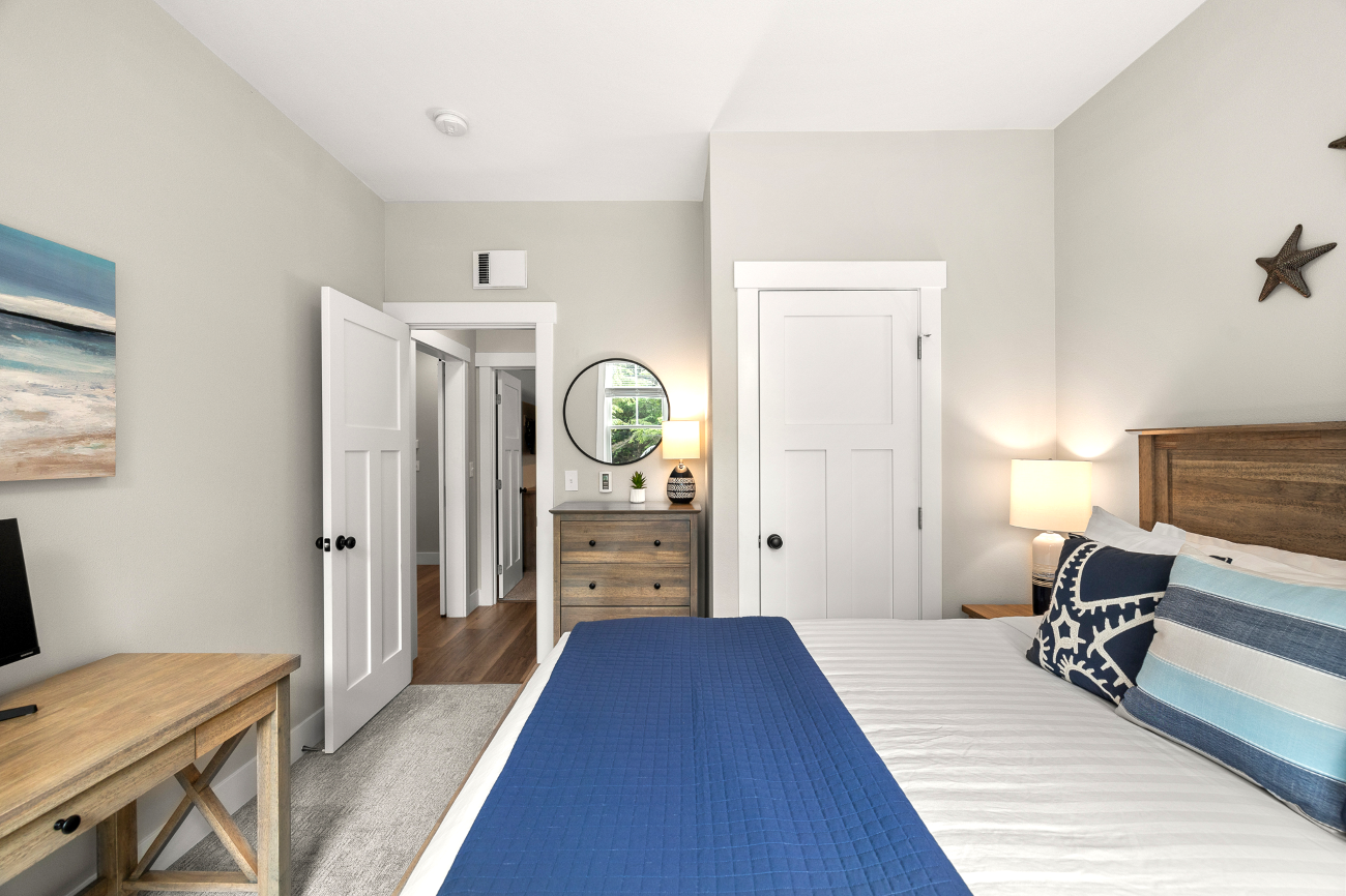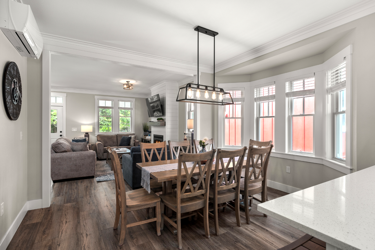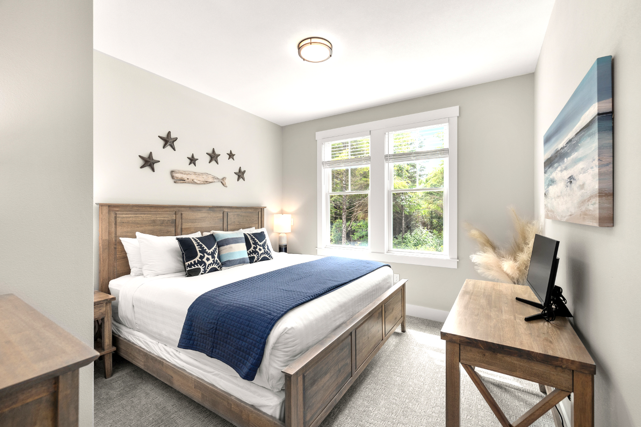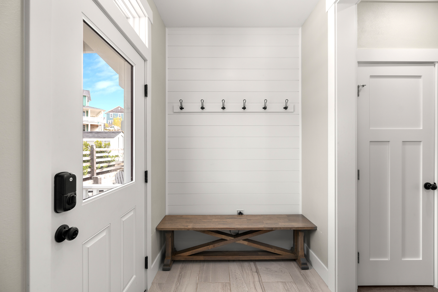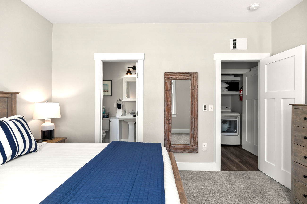 This light-filled, open-concept home is designed for seamless living. The common area features a cozy living room with a gas fireplace and classic shiplap accents, providing warmth and ambiance. Quality finishes throughout include elegant crown molding. The kitchen has pearl quartz countertops, stainless steel appliances, full subway tile backsplash, ample cabinetry, and a large central island for prep and serving. The layout includes three bedrooms. The spacious primary suite features an en suite bathroom with high-end fixtures. A sliding barn door adds privacy between the main living area and the guest suite, which includes two bright bedrooms and a beautifully finished shared full bathroom. A dedicated mudroom offers a durable floor and built-in storage, strategically located for easy entry and shedding outdoor gear after exploring nearby trails.
