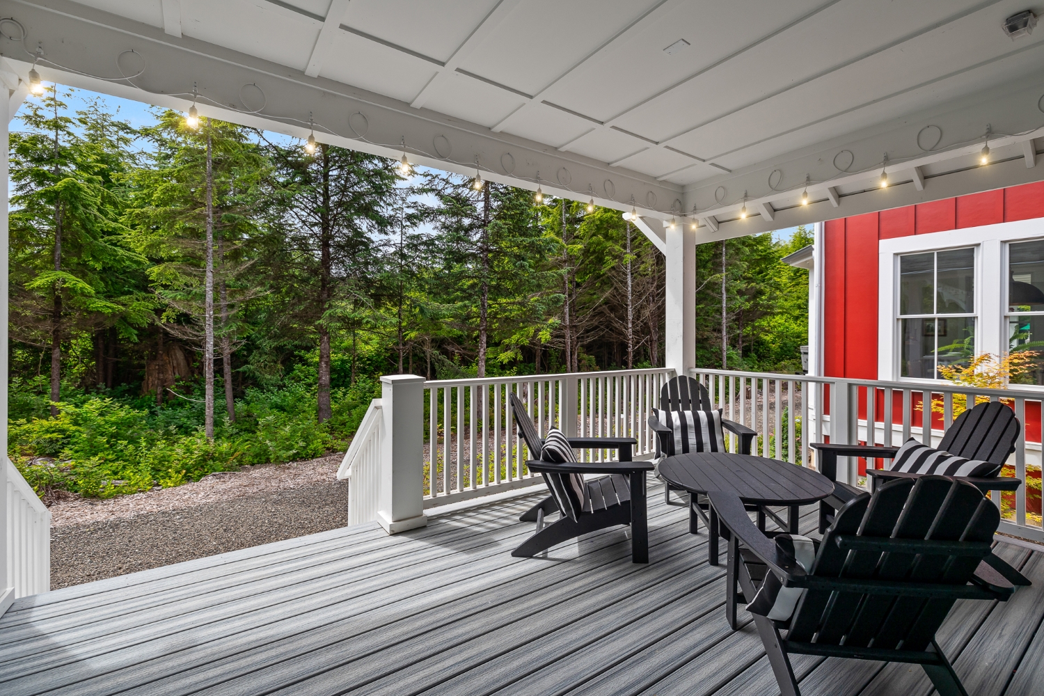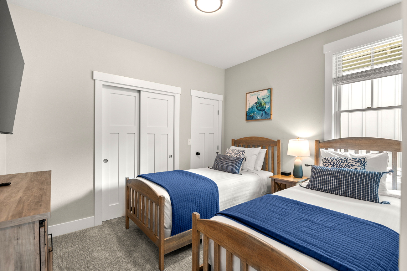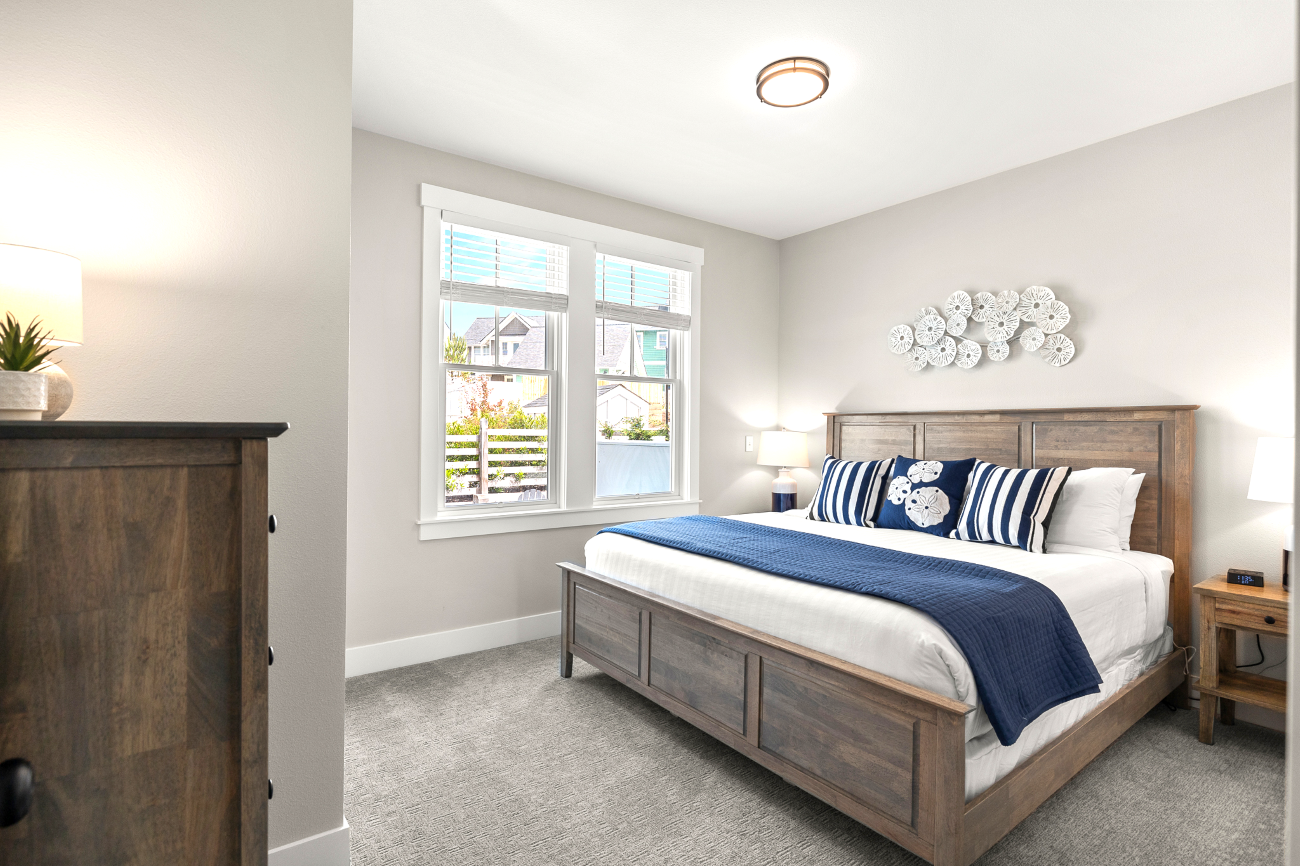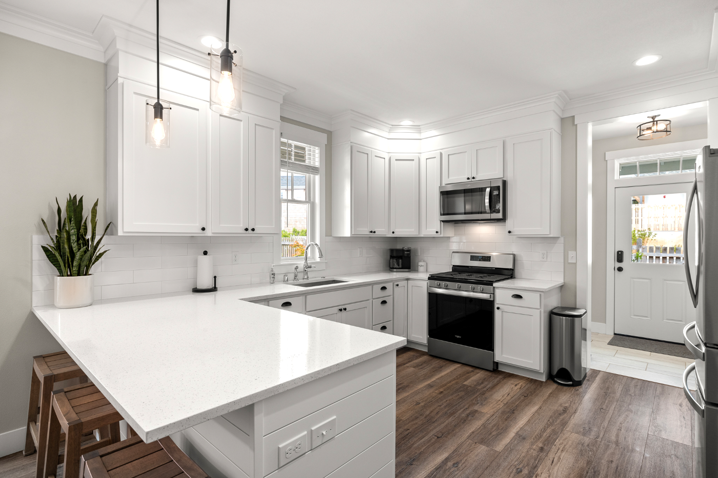 This light-filled, open-concept home is designed for seamless living. The common area features a cozy living room with a gas fireplace and classic shiplap accents, providing warmth and ambiance. Quality finishes throughout include elegant crown molding. The kitchen has pearl quartz countertops, stainless steel appliances, full subway tile backsplash, ample cabinetry, and a large central island for prep and serving. The layout includes three bedrooms. The spacious primary suite features an en suite bathroom with high-end fixtures. A sliding barn door adds privacy between the main living area and the guest suite, which includes two bright bedrooms and a beautifully finished shared full bathroom. A dedicated mudroom offers a durable floor and built-in storage, strategically located for easy entry and shedding outdoor gear after exploring nearby trails.