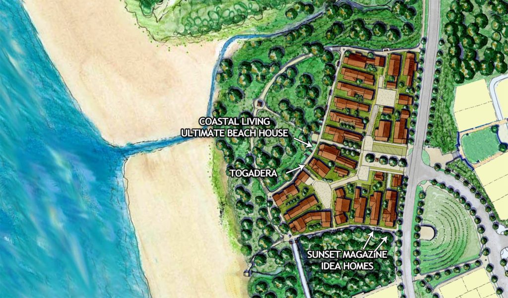 In addition, the back entrances come from the lanes where cars are neatly tucked away in carriage houses and port cocheres. Each Oceanside House presents two inviting fronts to both the Esplanade and the lane. The entry lanes are well detailed and take on even greater importance as community spaces. They have been carefully designed with three small plazas that widen out from the intimate lanes themselves. Four additional walking paths radiate out between the houses to the surrounding Esplanade.