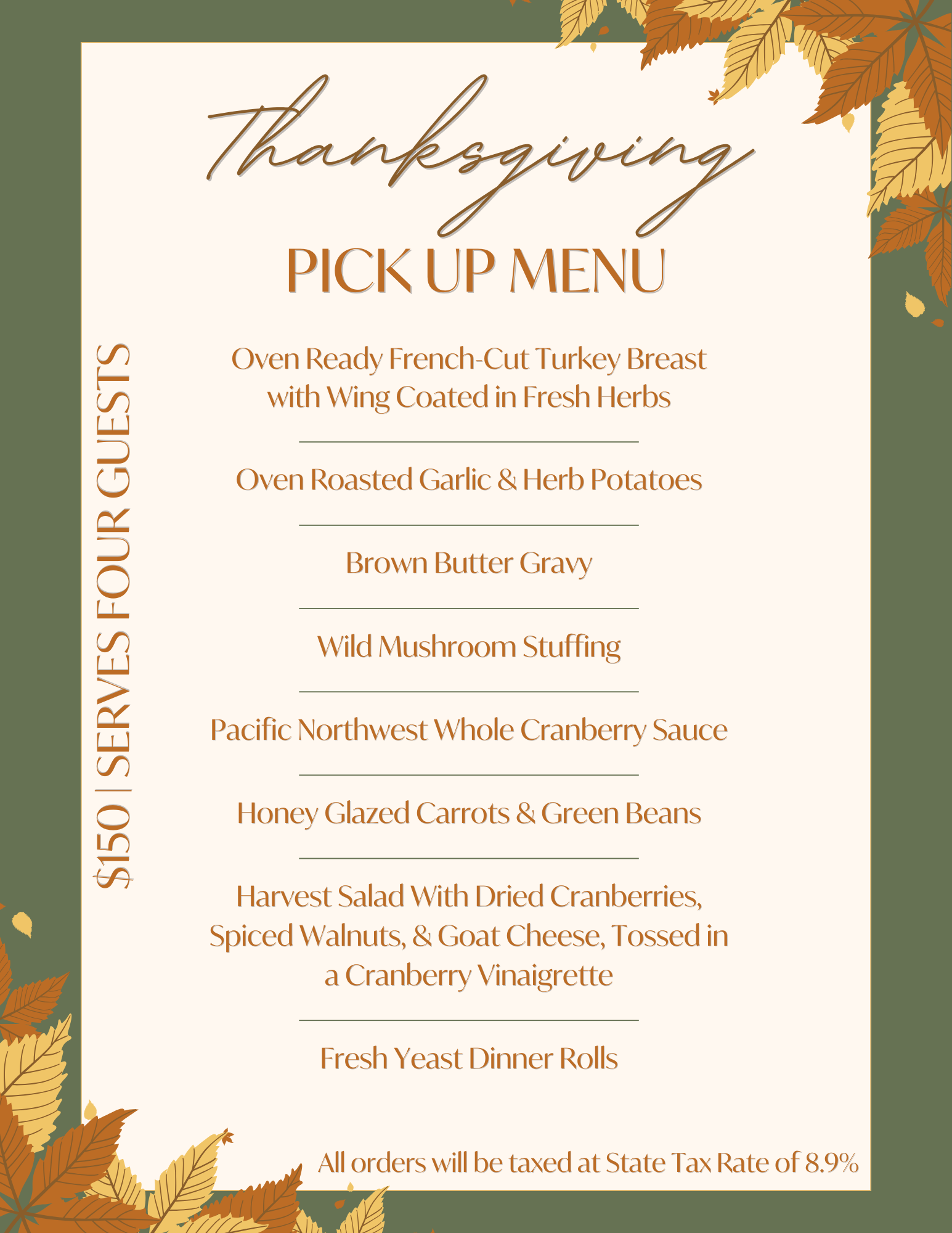 Simple cooking and reheating instructions are included. Pick up your meals at Town Hall (lower level, door on Madison Lane) between 3:00 PM and 5:00 PM on Wednesday, November 26th. Front door delivery is also available, for a fee. No deliveries are possible outside of Seabrook. Orders must be placed no later than Thursday, November 20th at noon.