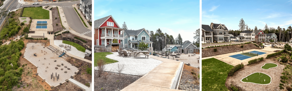 This delightful playground serves as a vibrant hub for children’s creativity and energy. As you step into the Alderwood playground, you’re immediately struck by the harmonious integration of nature and recreation. The playground is thoughtfully bordered by trail accesses, providing children with an instant connection to the serene beauty of Seabrook’s natural surroundings. Don’t forget to head into the Farm District while you’re in the area to see the horses, chickens, and ducks roaming about.